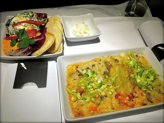 The American Express Centurion Lounge in San Francisco manages to serve just one entree but it's made right there and usually convinces with great quality - I always like it. A few wine tastings later I made my way out security again and over to the Admirals Club. Boarding was on time as well and the gate agent scanned my boarding pass; and with a smile and said ' Have a great flight Mr. Jacobi'. That's such a far cry from the grumpy United agents a terminal away who would rather get jaw surgery than smile and wish you a great flight.
