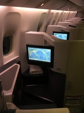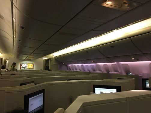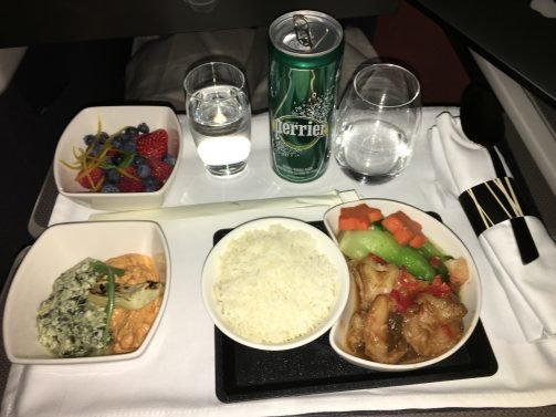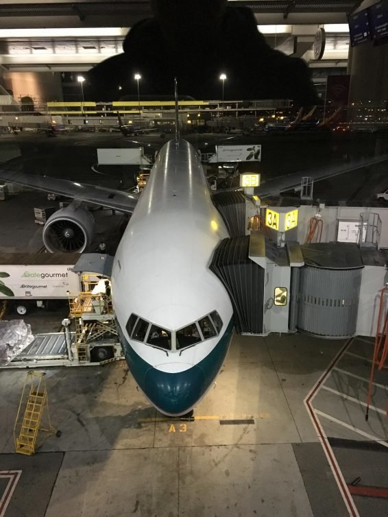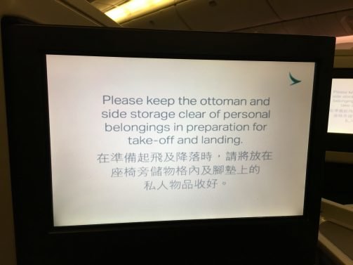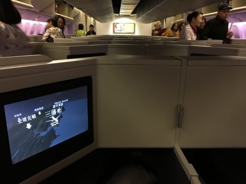 I fell asleep during take-off and used a short moment after we got to 10,000 feet to recline to the fully-flat mode and snoozed off. The full cabin was initially rather quiet but was soon filled with a huge amount of families with young children. We suspected those were travelers upgraded from the economy and premium economy sections of the other Cathay Pacific flight, which was used to give passengers with tight connections a better chance of making them.