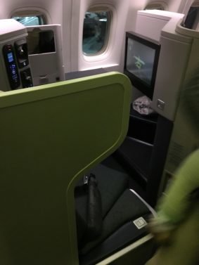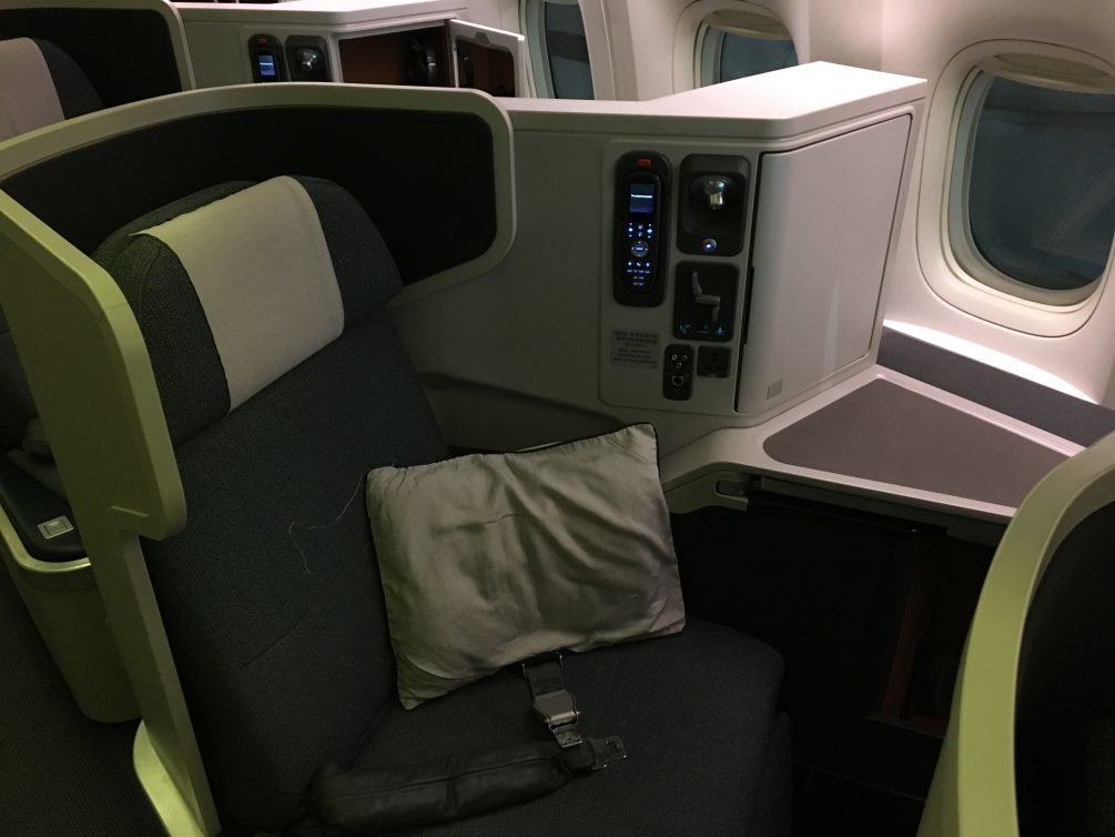 There was an approaching typhoon out over the ocean and there was a full ground stop just a few minutes before our scheduled departure to New Delhi. The pilot announced a 45-minute delay (departures had just resumed) but then we also had to offload passengers with a medical emergency (and their bags) which created a 90-minute delay in total before take-off. I was sound asleep through all that but obviously had to put up my flatbed on this A330 before take-off.