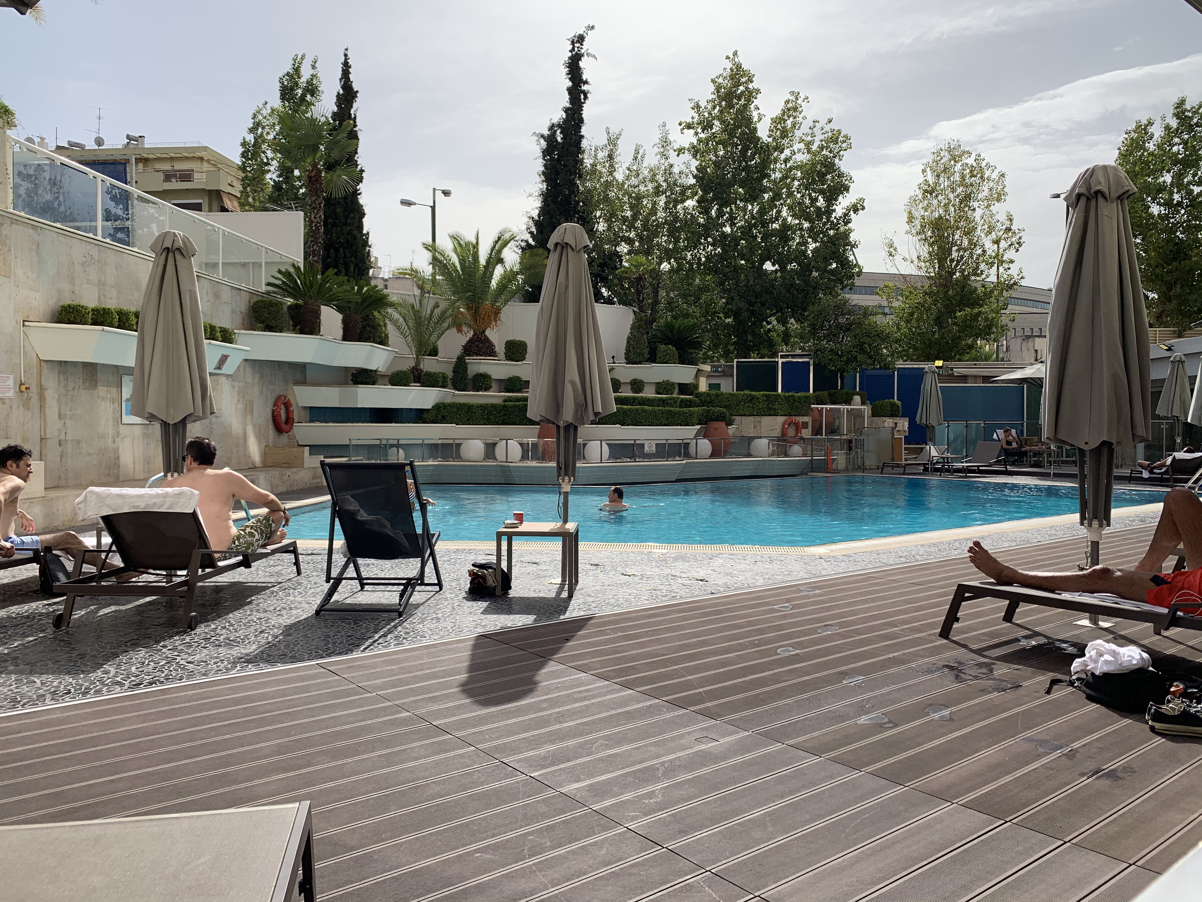 We made our way to the swimming pool and to our surprise it was rather packed. The pool is quite small and just allows for a few benches. All were taken at 4 PM and just a few opened up later. Indeed the Intercontinental Athens is a Business hotel and that was a mainstay of their revenue. As with many other hotels - business travelers are missing but leisure travelers are coming back. Well, this did not help the enjoyment of the pool (which is in a rather odd shape to being with).