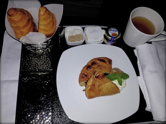 I fell asleep right after takeoff and skipped breakfast but it was served later for me - just about an hour before landing. Since I do not eat eggs I tried the Arabic choice of a warm pastry filled with dates. It wasn't bad but too sweet.