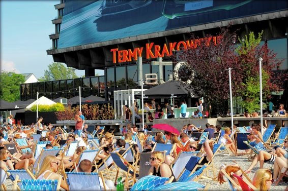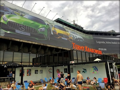 Forum is a rather ugly building (a former Soviet-style hotel that opened in the 80s) along the Vistula River. However, it is now used as a fake summer beach with a cool outdoor bar. The former 'concrete palace' is covered by an enormous advertising banner.