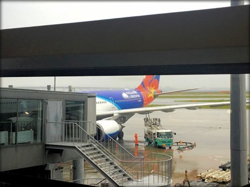 Boarding started right at 40 minutes prior to our new departure time. While the rain had let up while we were in the lounge, the winds seemed to be getting violent and the gusts seemed pretty bad. Everyone was trying to get off the ground. Once economy and business were about 70% full on this A330, we closed the doors and lined up for the takeoff position.