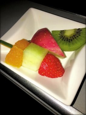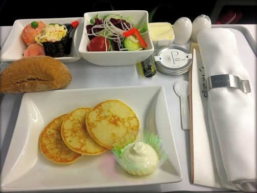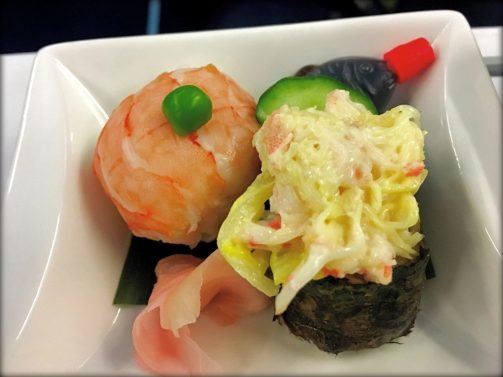 Besides a salad and sushi, there was a whole box of caviar on every business class tray! The caviar was excellent and so was the sushi. The bread roll that came with it was excellent, too.