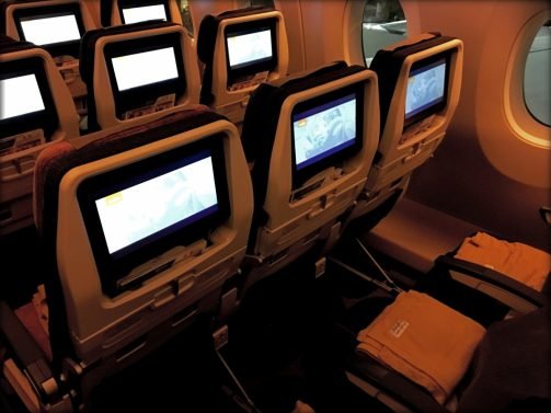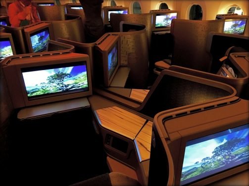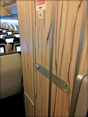 Business class was full with the exception of 3 seats. We moved one row back but were really too close to the galley for my taste. The cabins were really quiet and well-behaved and I took the opportunity to check out the premium economy and economy sections. All were full that night and were equally well-designed. Even the bathrooms had faux wood decor and the displays in economy class seemed huge and a joy to look at.
