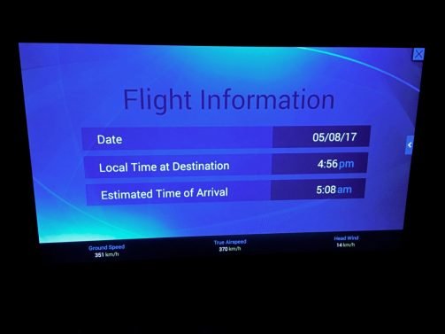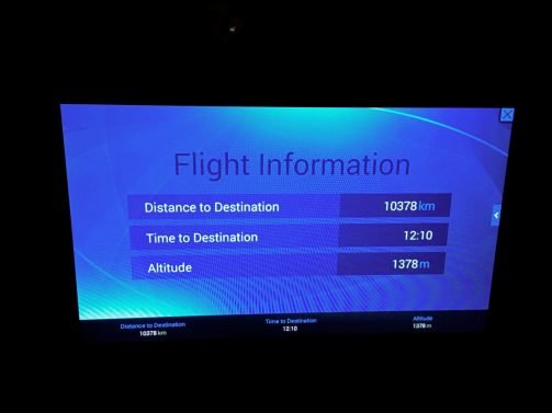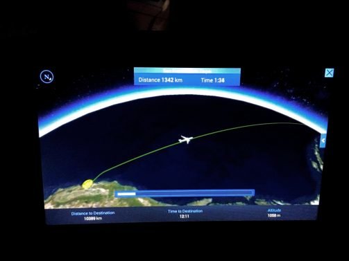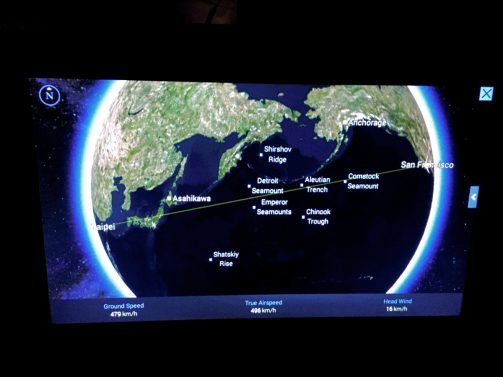 After a quick taxi and takeoff, we did two easy turns and were on our way towards the southwestern islands of Alaska. I wanted to watch a movie but fell asleep almost right away, though I first managed to delay my food service and ask for pajamas (which are not provided).