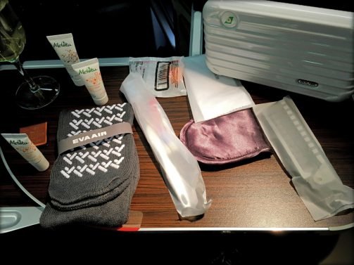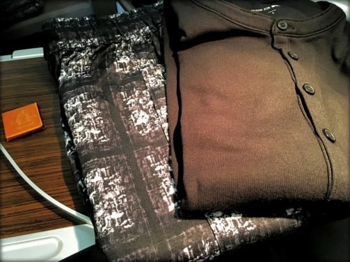 Pajamas and amenity kits were given out. The pajamas were a tight fit, though better quality than most (e.g. Singapore Airlines).