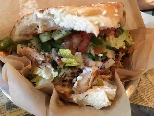 All the way to right outside the university entrance you'll find Aristo's. I had a good chicken souvlaki and the service was top-notch as well.