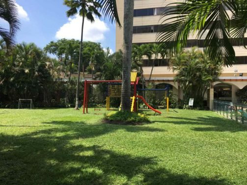 There is also a spa area right behind it with a sauna, steam bath, and Jacuzzi. The grassy area features a small soccer field and kids playground.