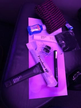 Indeed we pushed back from the gate right on time but would spend 40 minutes taxiing around the airport and waiting for takeoff. Meanwhile, I went through the amenity kit and found some quality items.