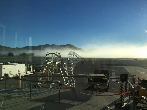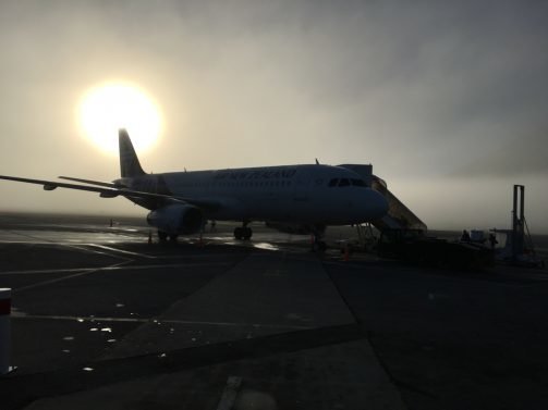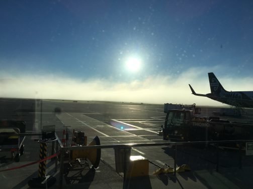 The return flight caught a three-hour delay, as the airport was shrouded in thick fog.