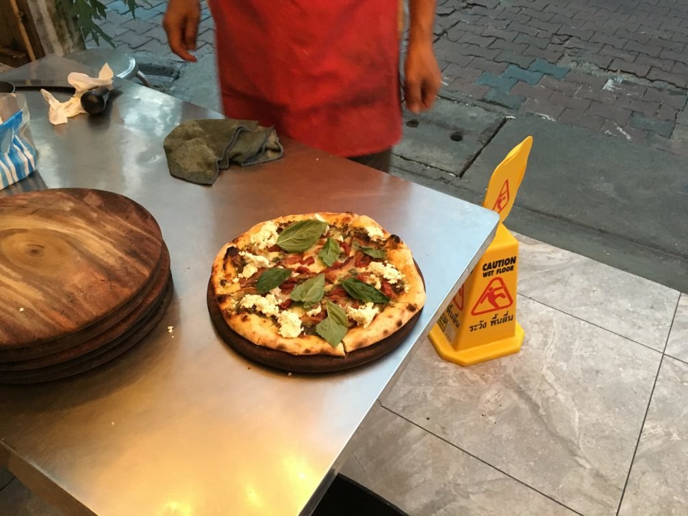 By Hand Pizza is an all-outdoors, low-key but yummy pizza affair. The huge pizza oven cooks you delicious, Sicilian-style pizza for just THB 160.
