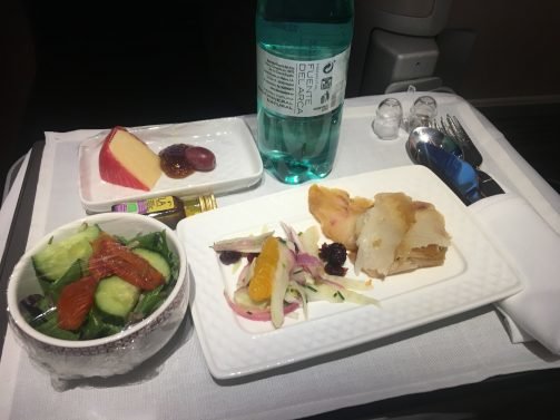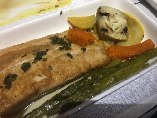 My tray was simply dropped off at my table without any words with the plastic cover foil still attached to the dinner items. My request for a champagne was acknowledged but apparently none was on the cart. About 15 minutes later I'd get a small bottle of sweet, sparkling wine that was frankly horrible. By that time the main course was already in full swing. Dinner was over in less than 30 minutes but a Fast Food Drive Thru manages better service than that.