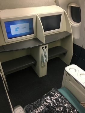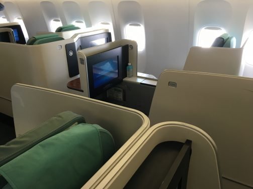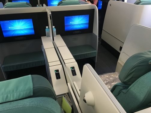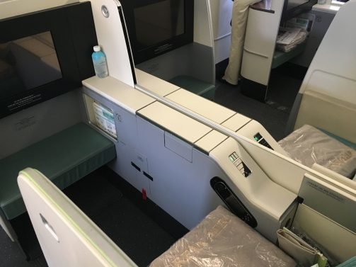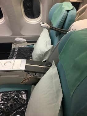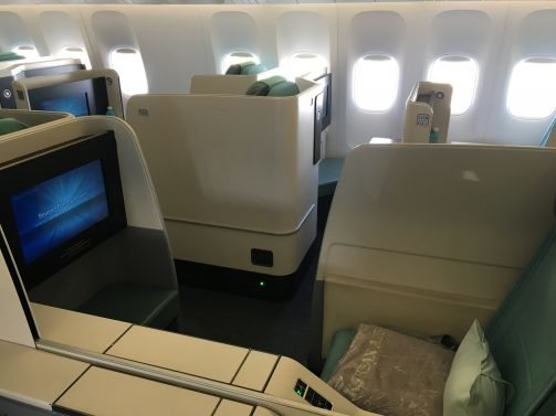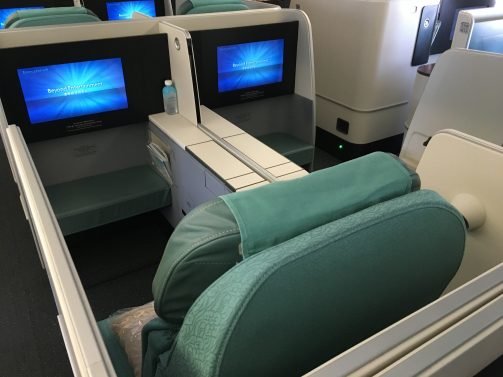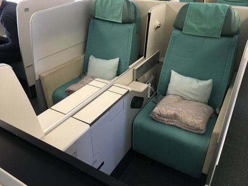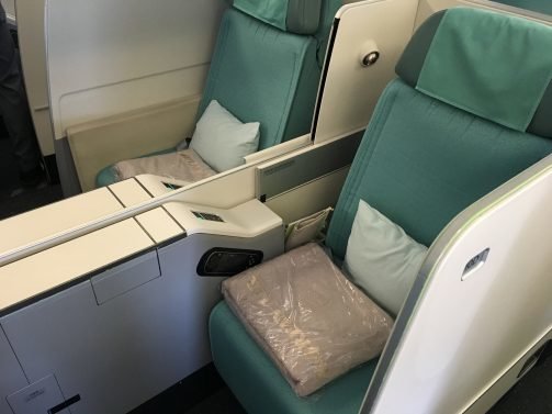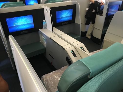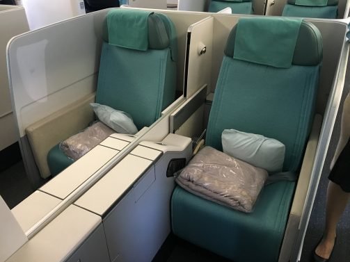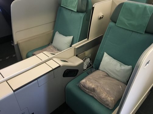 Korean Air uses an angled lie-flat seat in a 2-2-2 configuration for these flights. They resemble the Qatar Airways old 777 model quite a bit. Business Class would be 100% full that night and my aisle seat was better than I expected.