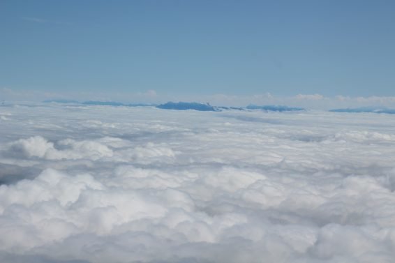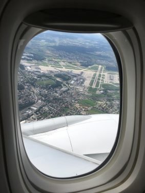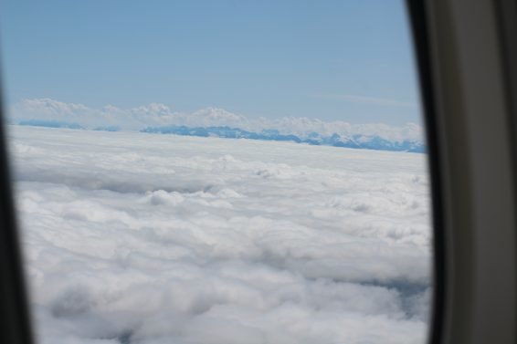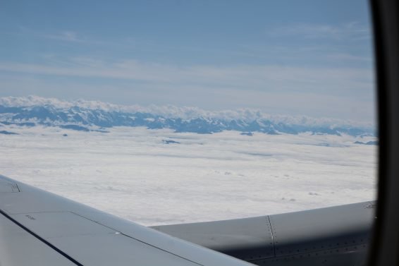 Oh well, we got underway with 90 minutes delay eventually and had a wild takeoff. At just a few hundred feet we banked 26 degrees left and went up with full takeoff power until we looped back over the airport at 12,000 feet with another plane just taking off. After a few more rough turns we got over the clouds and the snow-capped mountains of the Alps came out.