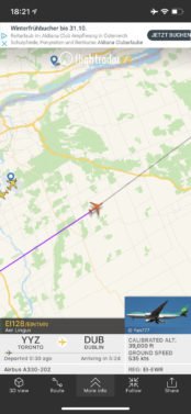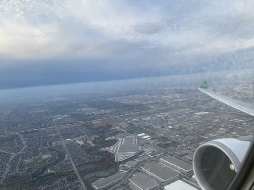 Everyone seemed in a hurry despite a very short flying time of under 6 hours for the quick hop to Dublin. We got going on time and take-off was into a beautiful sunset over suburban Toronto.