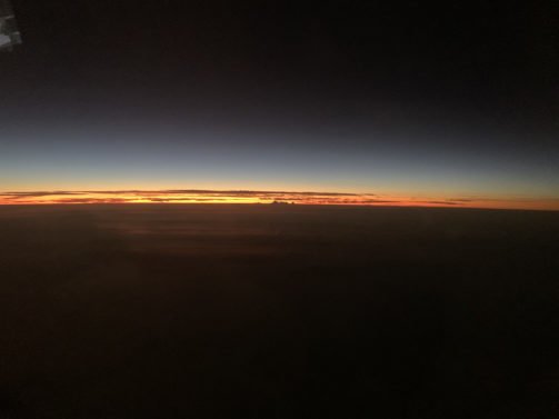 The sun would come up just about the same time but the flight attendants shut down all the window shades quite immediately.