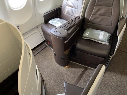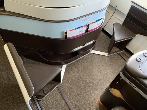 Hawaiian Airlines has decided in favor of a rather unique model of lie-flat seats. It comes in a slightly staggered 2-2-2 configuration. The annoying part are the footrest/ ottomans that not only restrict foot space when getting into your set (especially when sitting near the window). Even worse the floor is not really even and the area around it is elevated making it super easy to lose your balance when getting in and out. This is simply a safety hazard. Virgin Atlantic misguided seat on the A340s and B7897 has a similar issue.