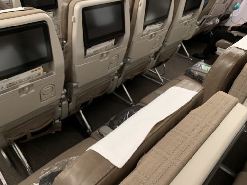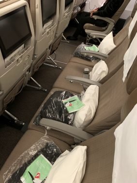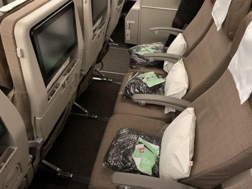 Boarding was announced right on time at the furthest away gate and it seemed that this would not be a full flight. Indeed, Economy Class was just 2/3 full while Business Class was seemingly 100% full. I had chosen a middle seat and bet on the fact that the whole row would be empty (which was true when I checked-in). Alas on the far end of the four-seater there would be another person when I boarded. There was plenty of space with two seats empty in the middle but not enough to lie-flat.
