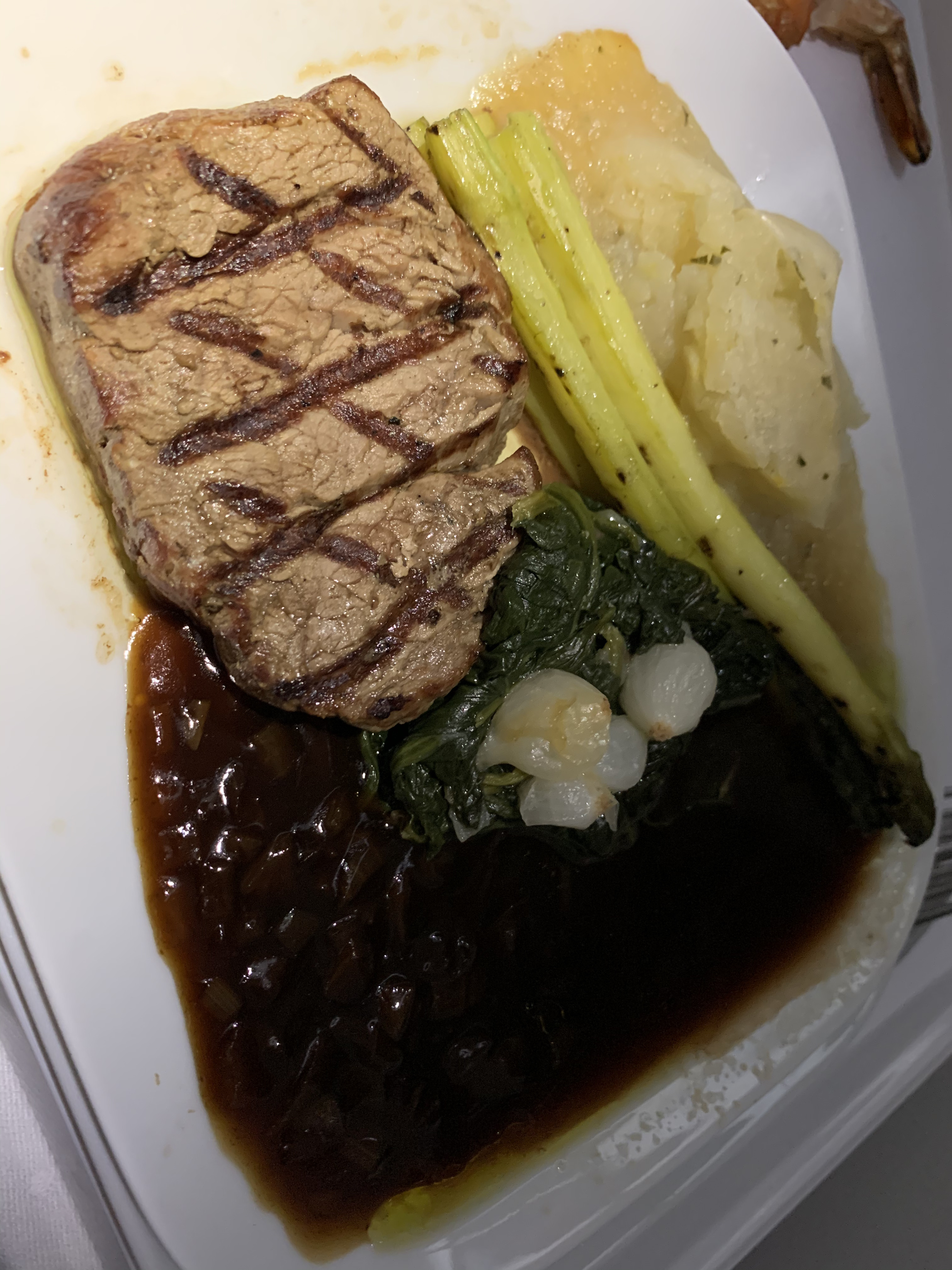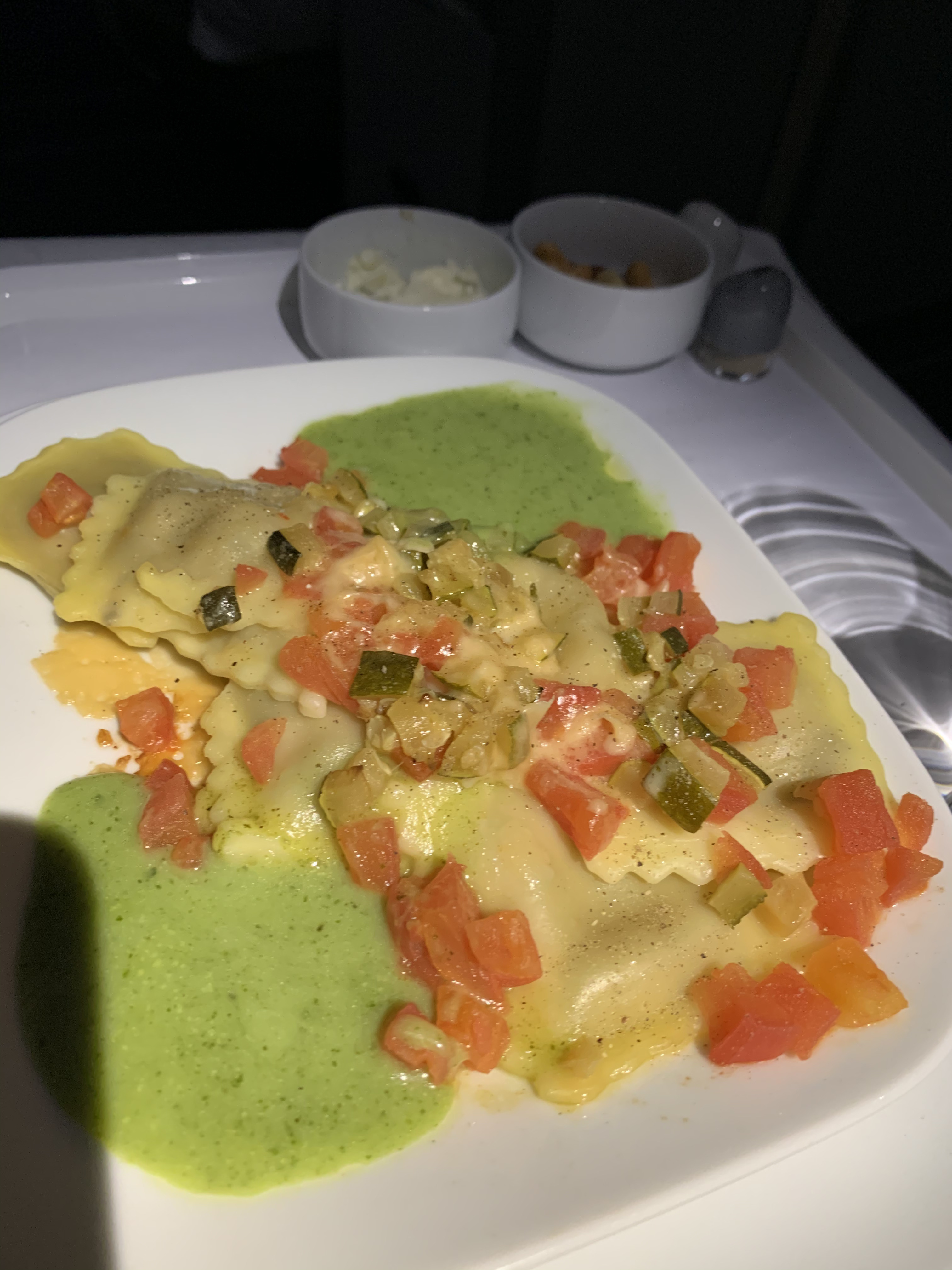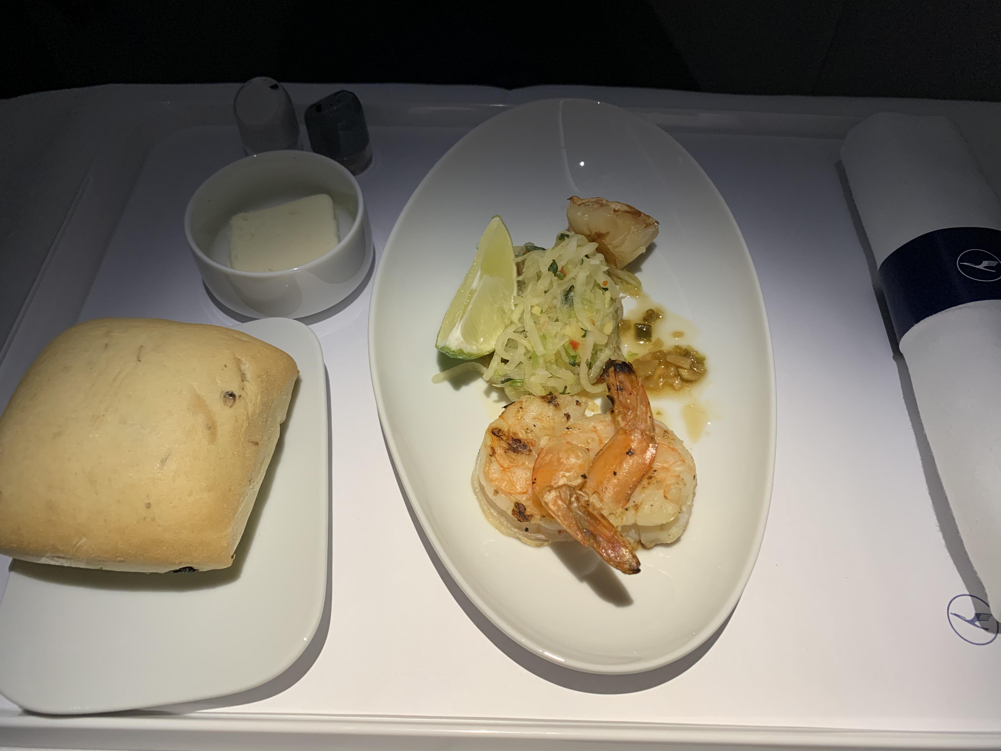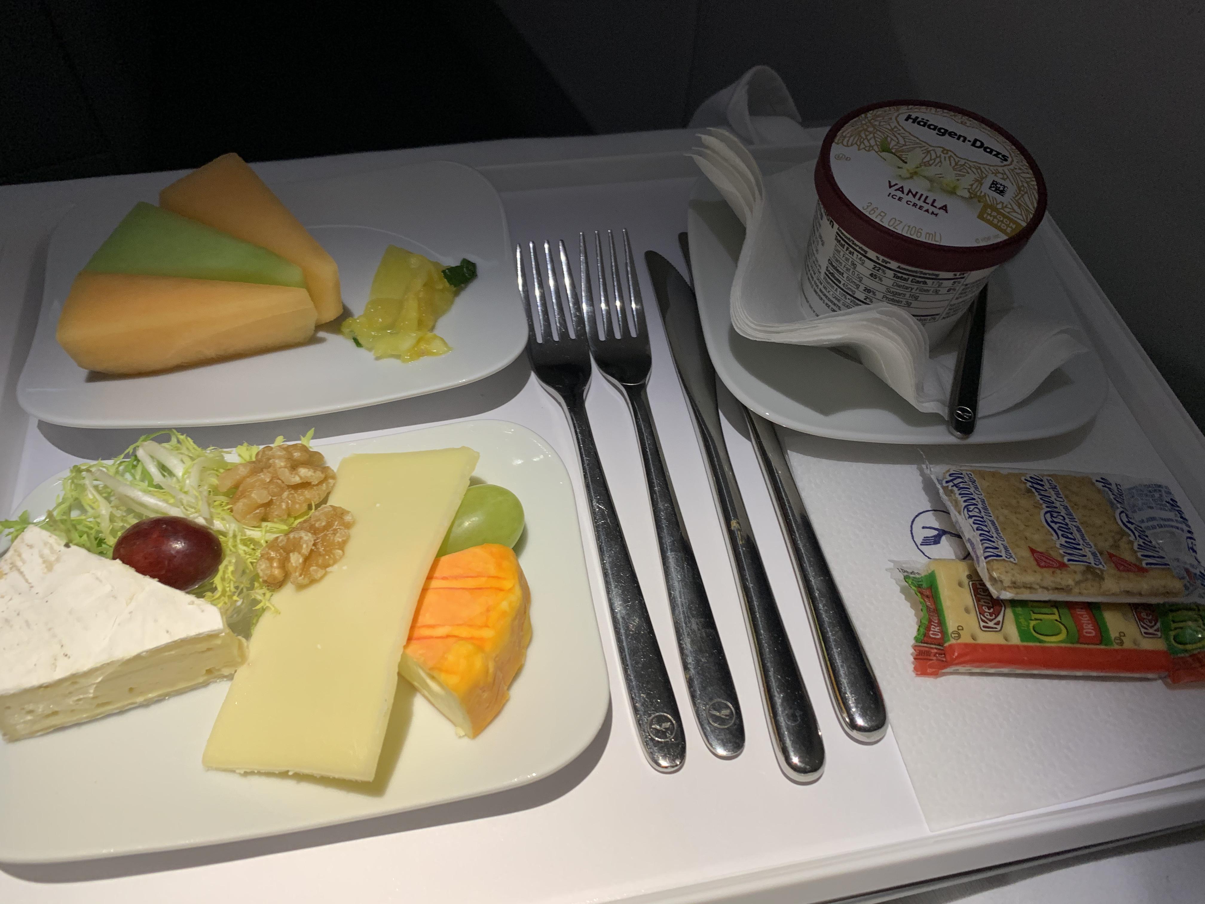 Meal service started quickly and warm nuts and champagne would be served first. I opted for the prawn appetizer and the beef main dish. I found both to be excellent - definitely Business Class material! The dessert was not as good (I ordered a mix of all the options as I was curious as usual). I had also asked the flight attendants to prepare a small wine testing which they happily obliged to (much to my surprise). There were several excellent wines (most of the Italian) that I really liked.