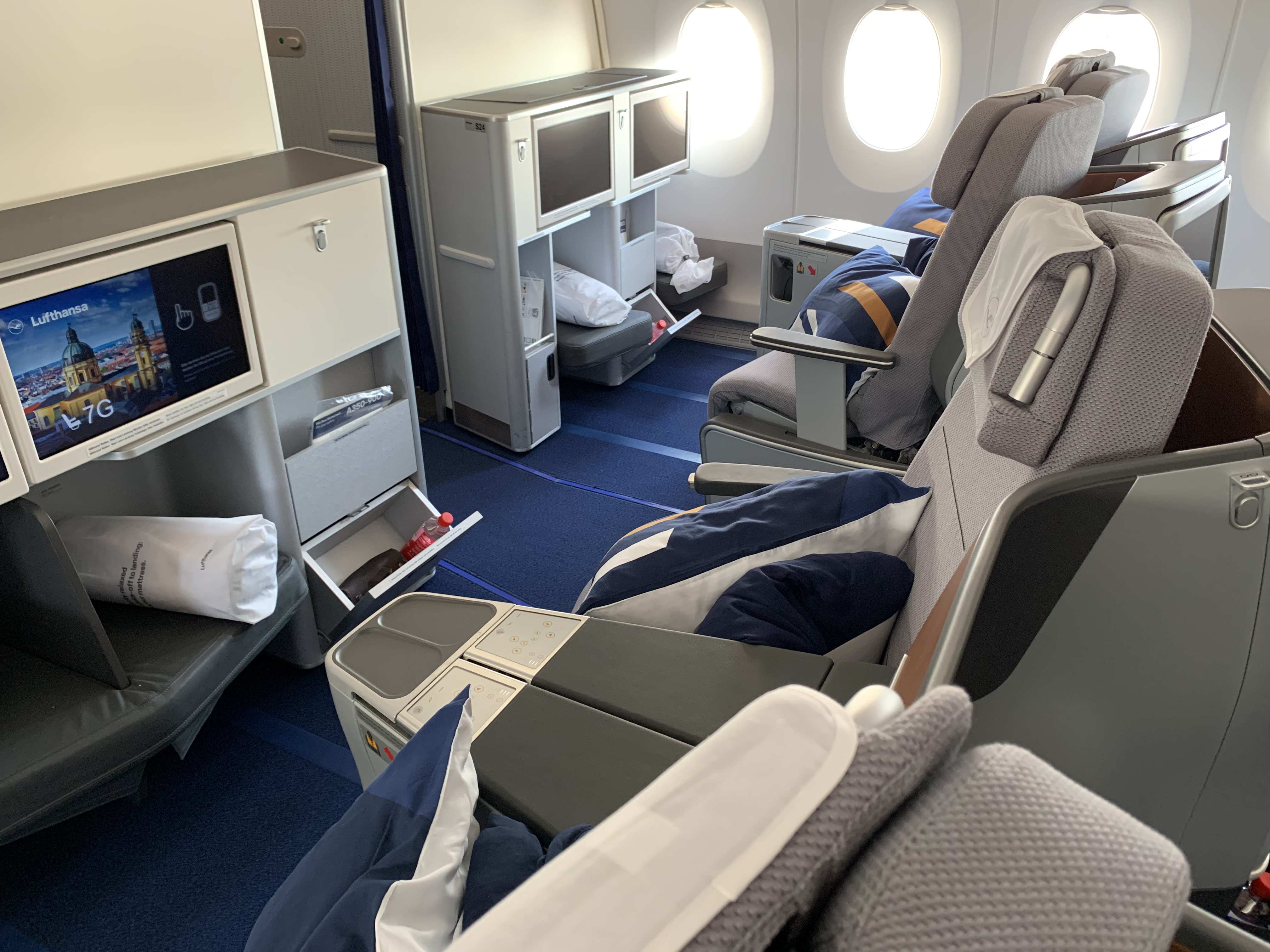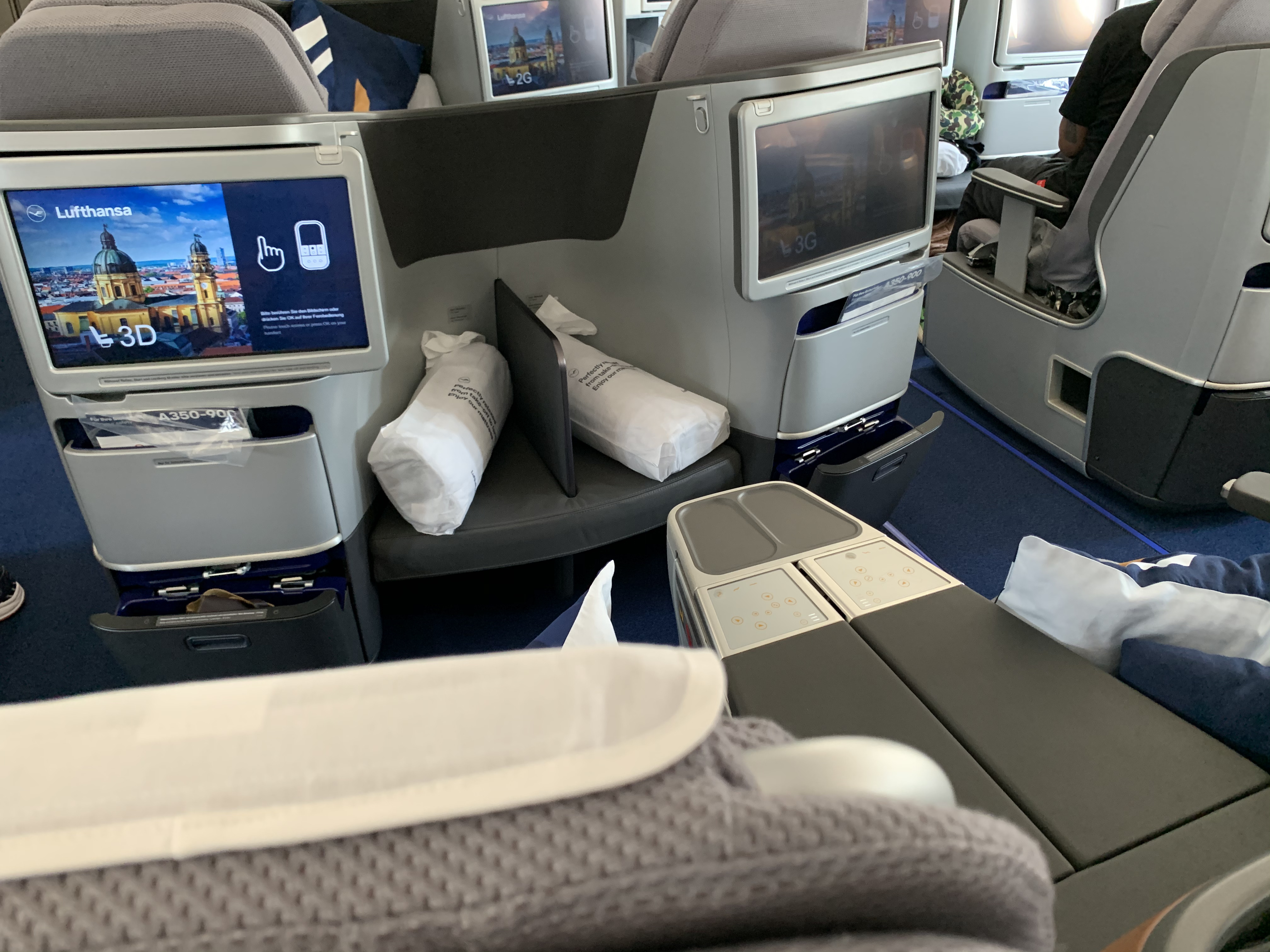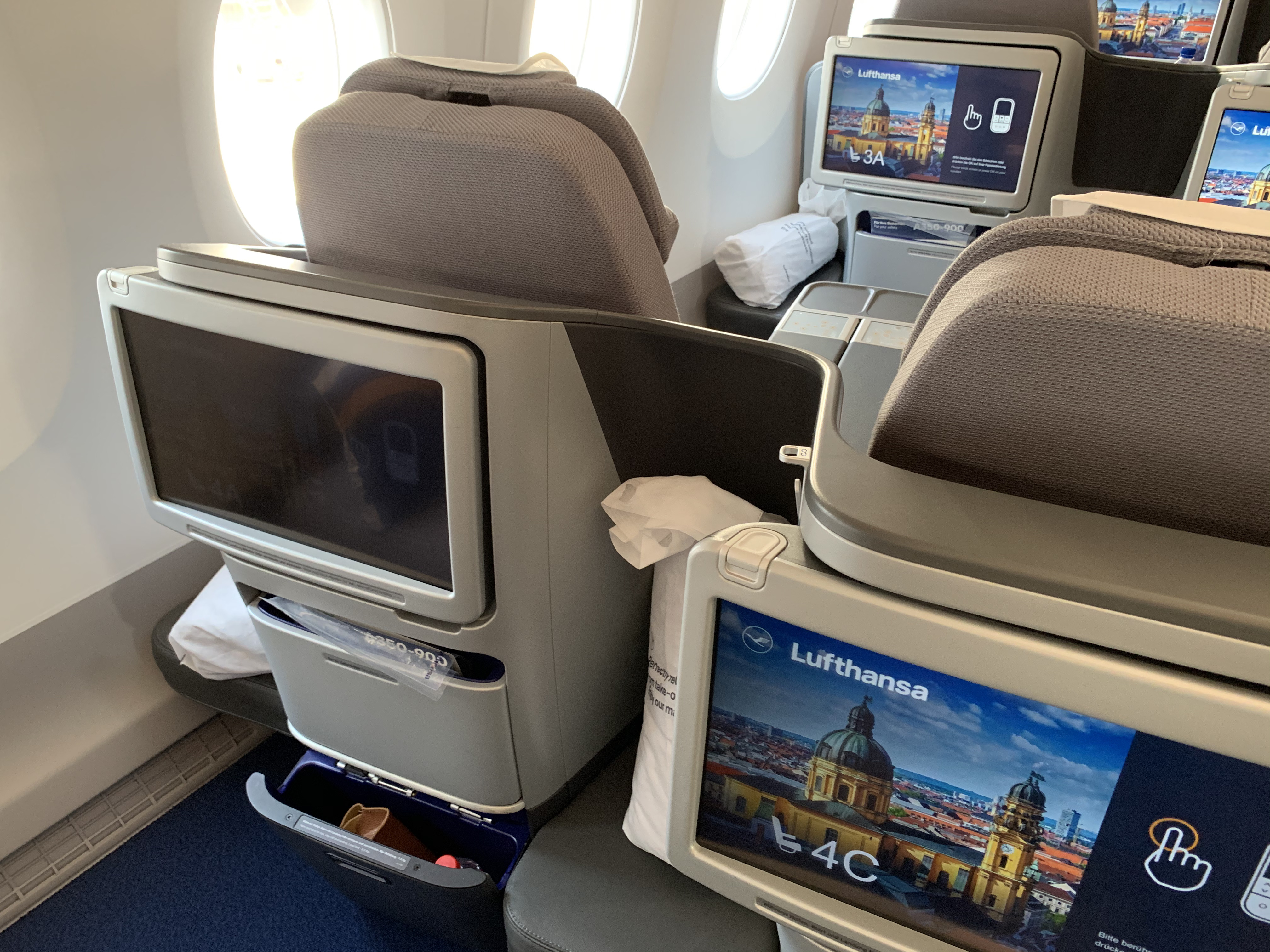 Lufthansa has equipped their A350 Business Class cabin with a slightly updated version of the seats they use for the Lufthansa A380 Business Class and many other airplane models in their fleet. The seat is at least a generation or two behind current. Business Class seat. models. The cabin looked neat and I liked the color scheme but there is no privacy, the seat is rather cramped, there is minimal stowage and the lie-flat position resembles an angled lie-flat more than a true lie-flat. The good news is that there is ample vertical space (unlike the Swiss Airlines B777 Business Class seat).