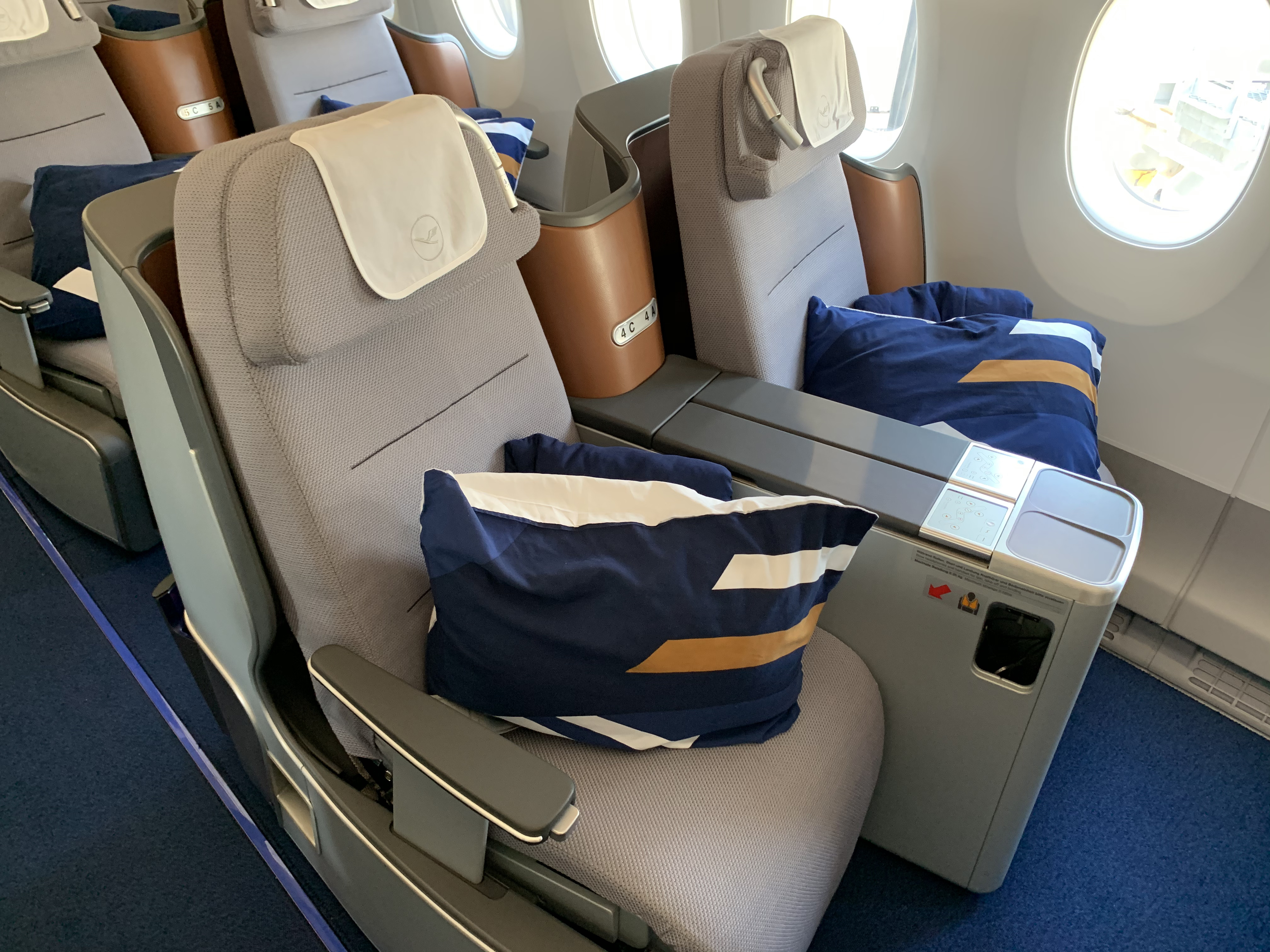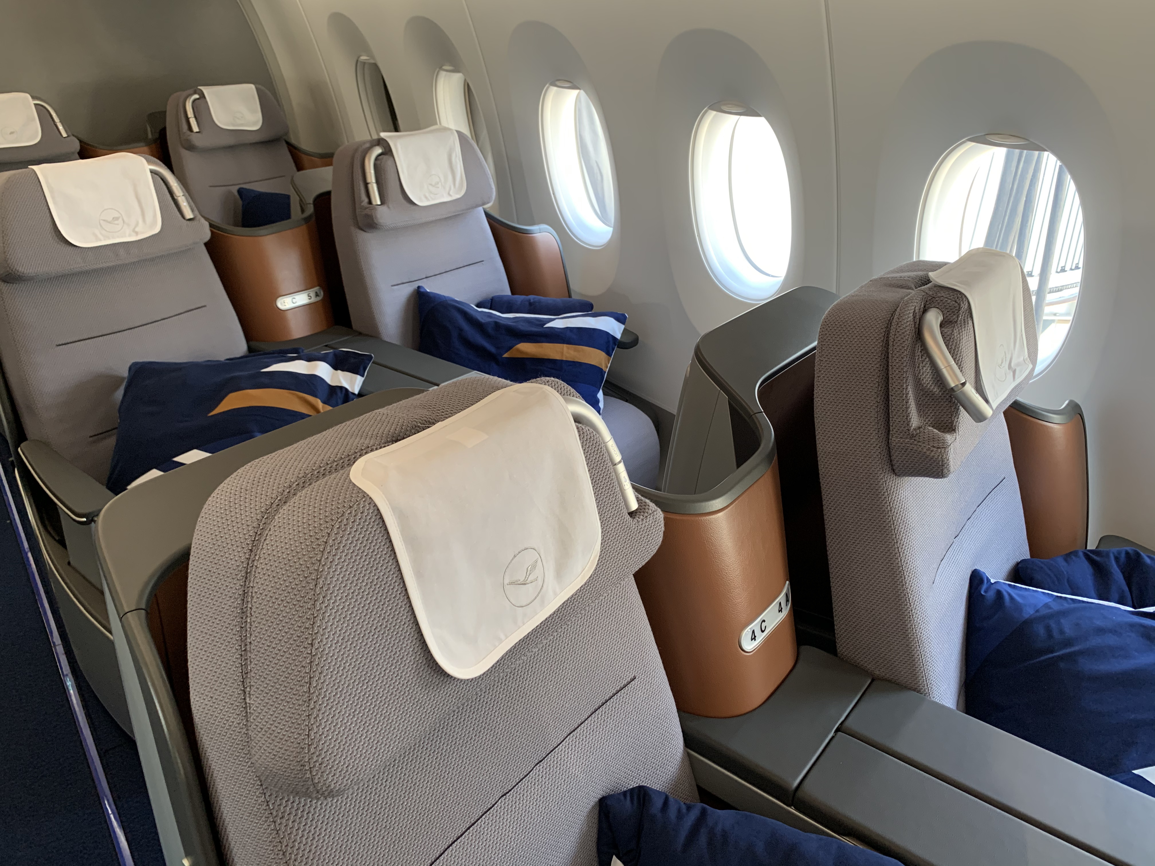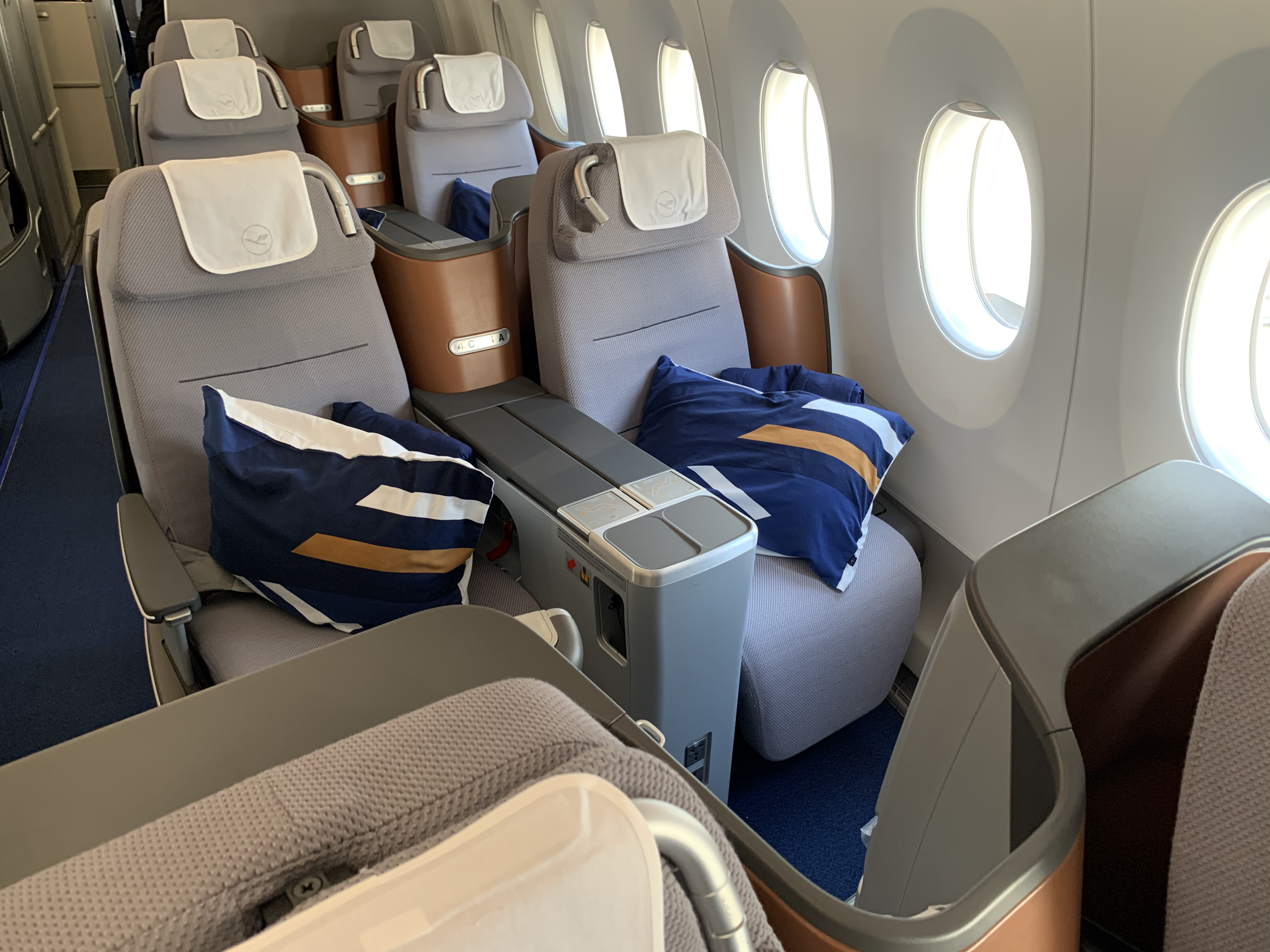 Lufthansa has equipped their A350 Business Class cabin with a slightly updated version of the seats they use for the Lufthansa A380 Business Class and many other airplane models in their fleet. The seat is at least a generation or two behind current. Business Class seat. models. The cabin looked neat and I liked the color scheme but there is no privacy, the seat is rather cramped, there is minimal stowage and the lie-flat position resembles an angled lie-flat more than a true lie-flat. The good news is that there is ample vertical space (unlike the Swiss Airlines B777 Business Class seat).