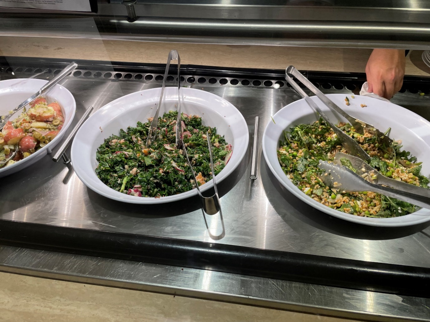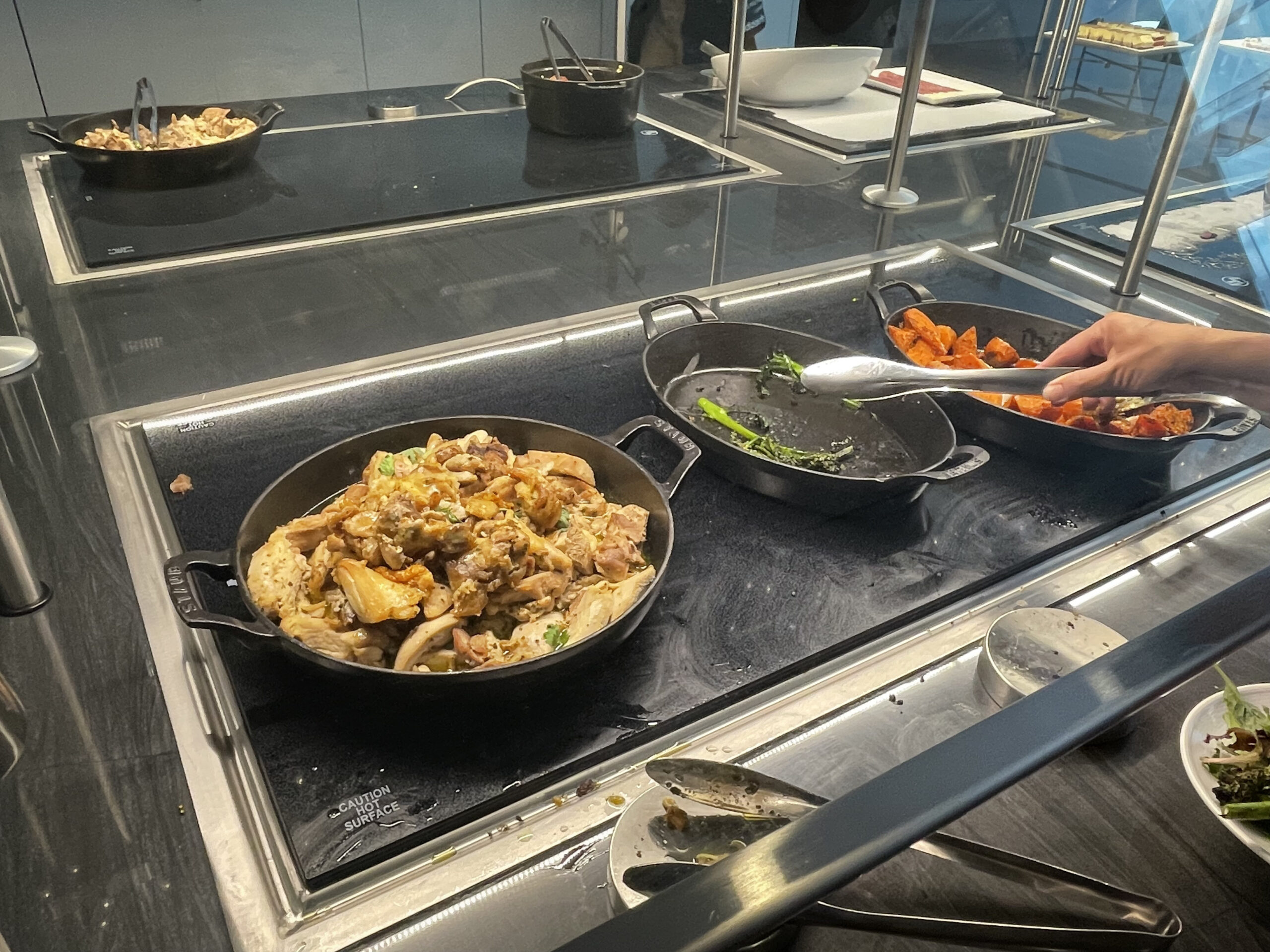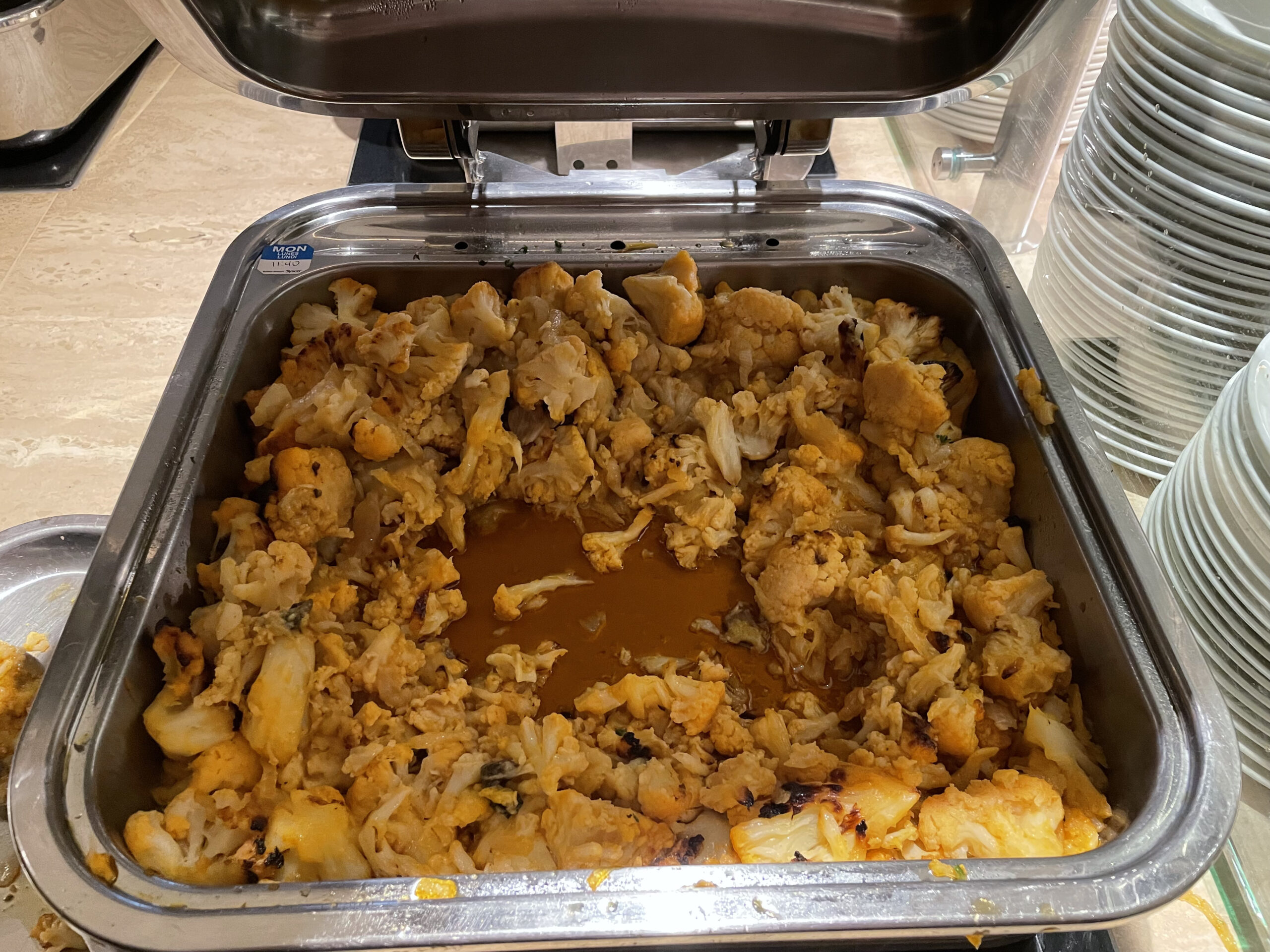 The buffet offers a range of cold salads as well as hot dishes, catering to various dietary needs and requirements. When we visited, there was a delicious creamy chicken and mushroom dish on offer, with wilted tenderstem broccoli and roasted sweet potatoes to accompany. For vegetarians, the cauliflower curry looked divine.