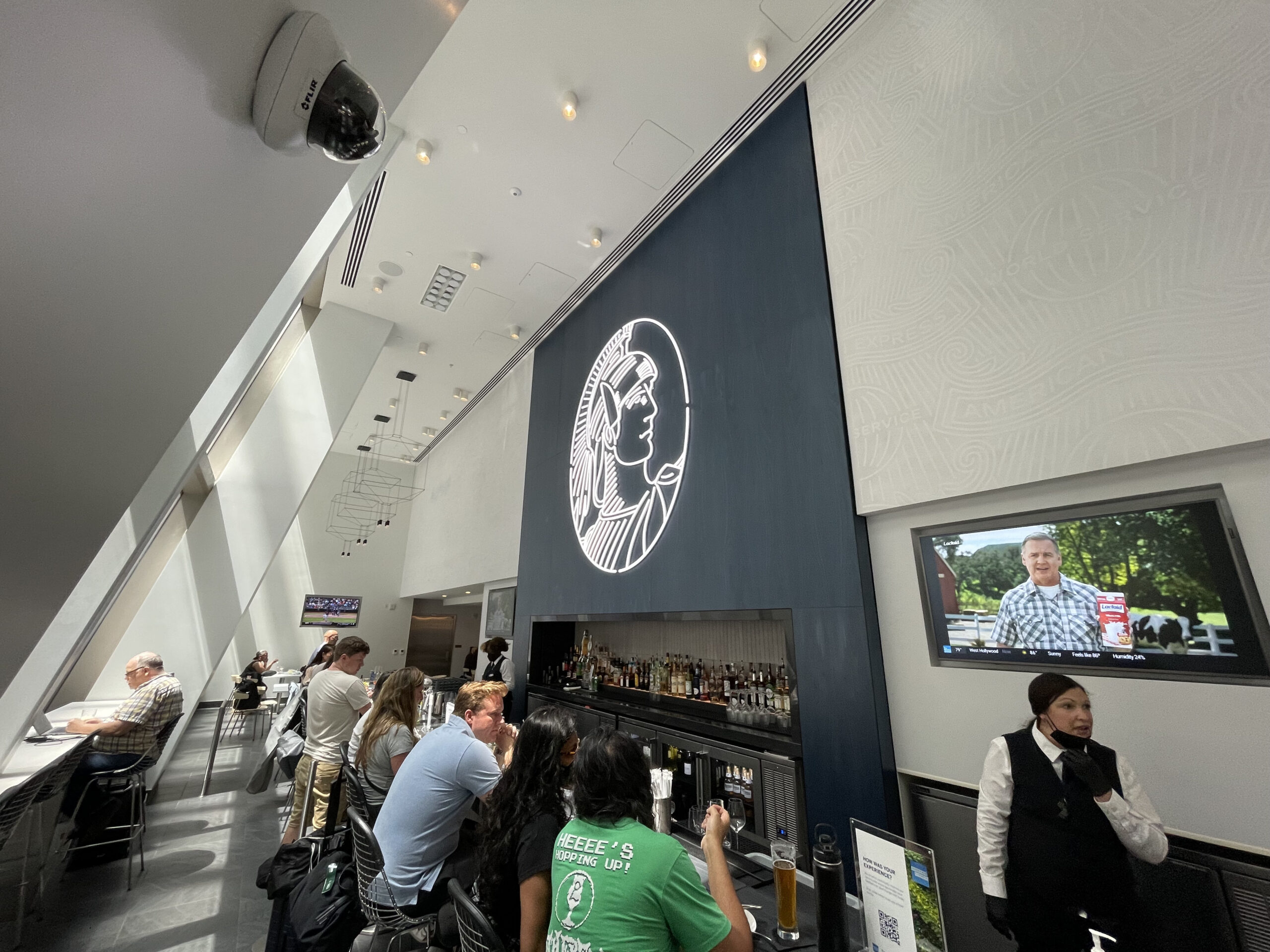 One of our favorite spaces at the American Express Centurion Lounge in Los Angeles is the main bar. Here, you'll find various seating options, from bar stool-type seats along the wall to tables and chairs for dining. The crowning glory of the bar is the blue backdrop behind the serving area,, complete with an illuminated centurion logo.