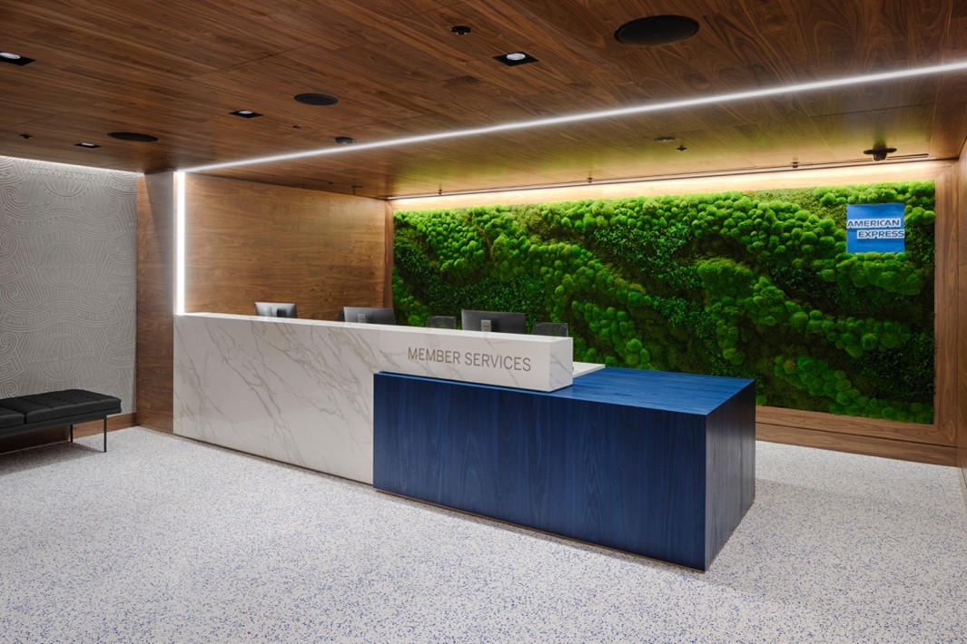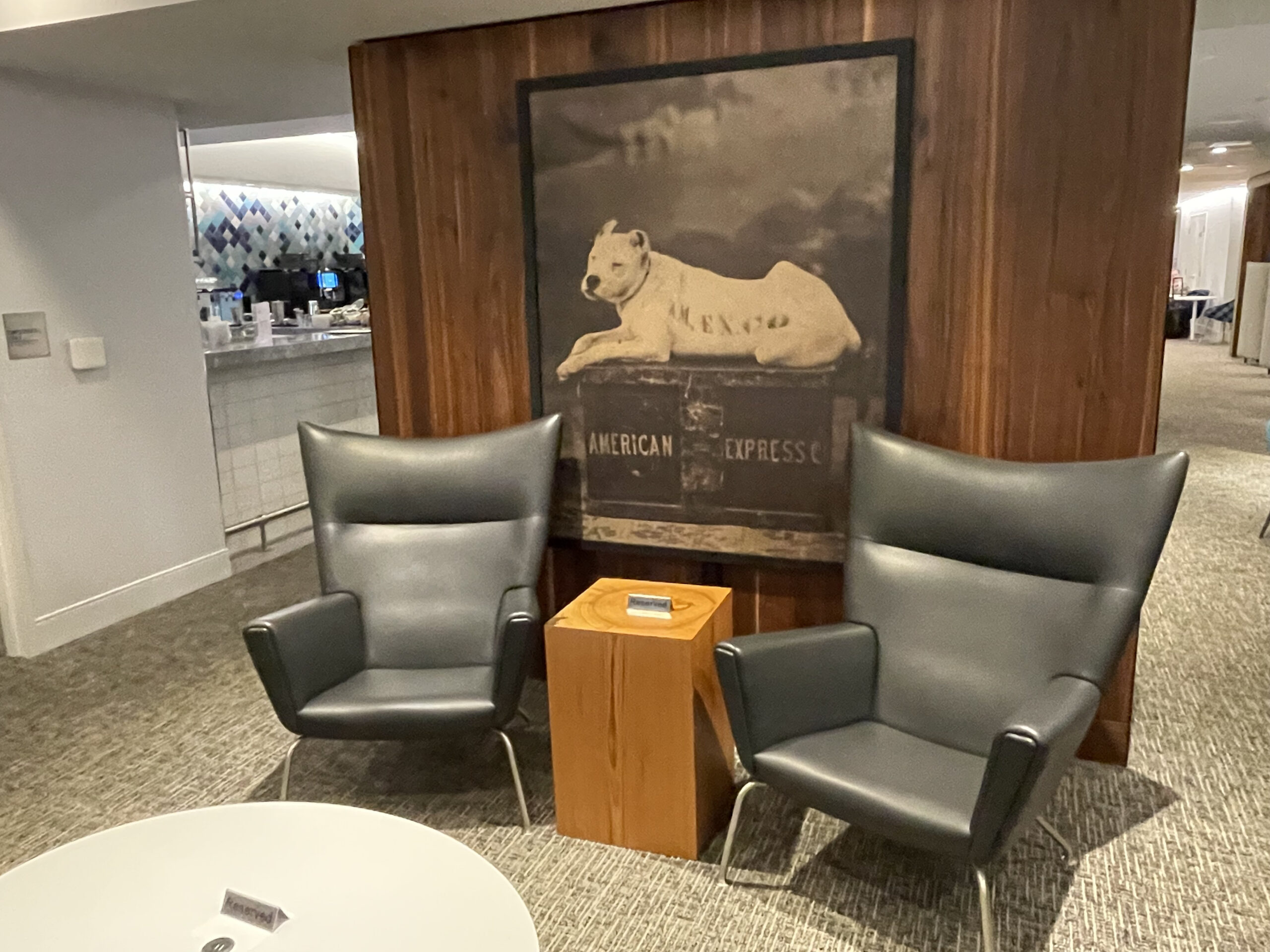 To the left from here, you'll find a cosy space with a few leather chairs and American Express’s watchdog logo.