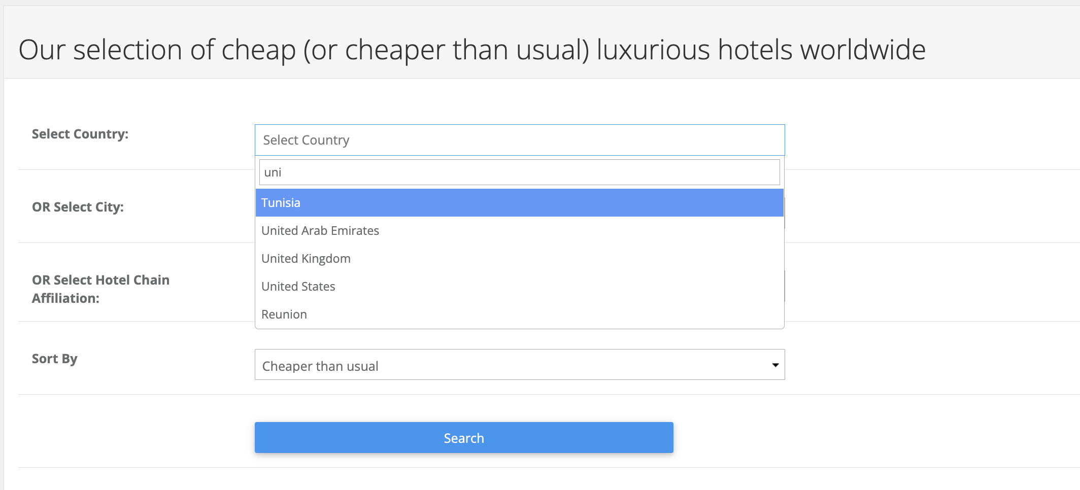 To search for a hotel in a specific country, just start typing the name. By the time you get to the third letter, you should find your destination appearing in the list below. Simply select that to enter it into the search box.