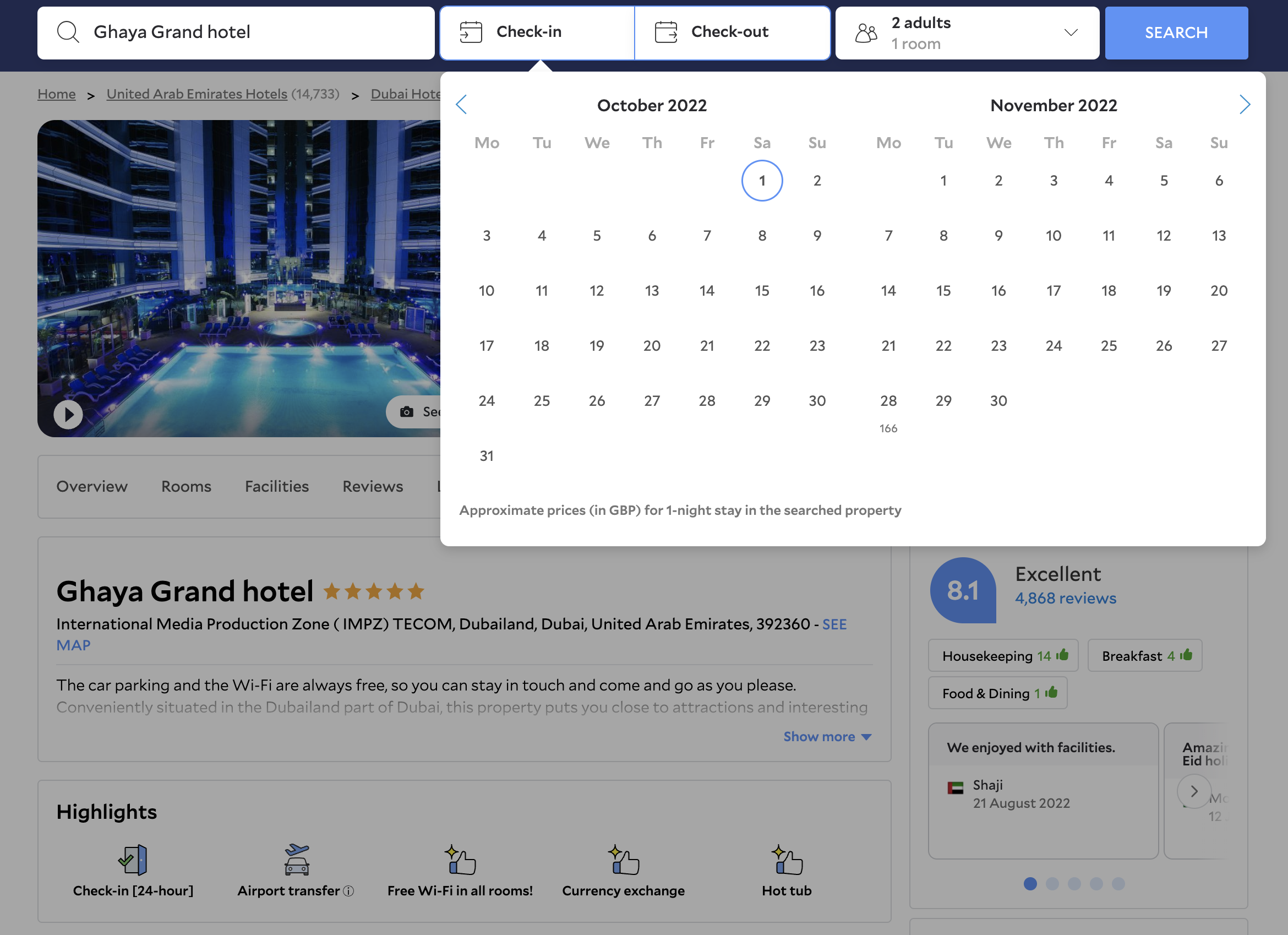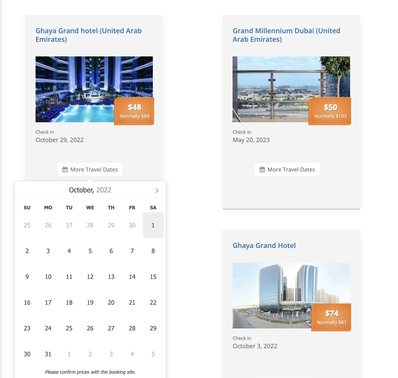 For one final example, we’ve reordered our search by ‘the cheapest (but still luxurious) to find the very best price possible. Up pops Ghaya Grand Hotel for a stay on October 29th, costing just $48.