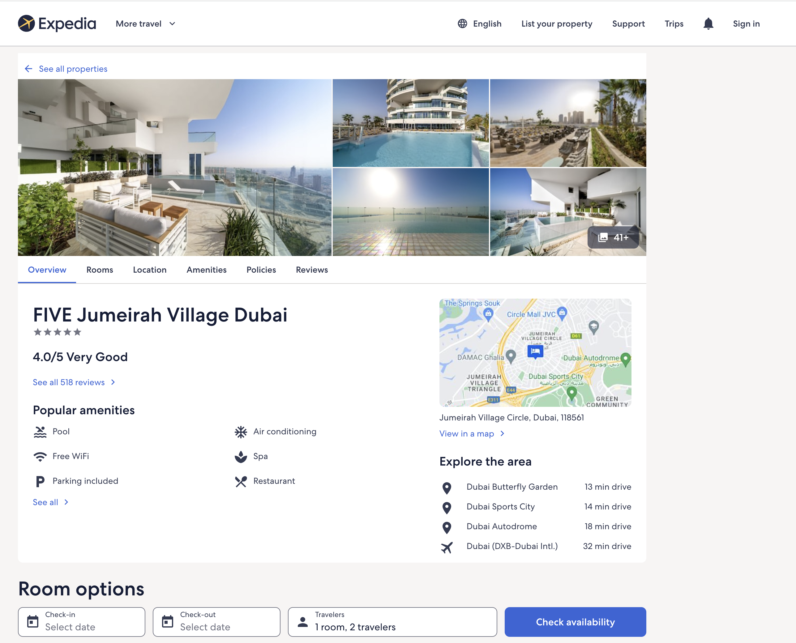 From our search, we picked one of the most luxurious hotels in Dubai – FIVE Jumeirah Village. This took us to the property page on Expedia, where we found a deal for an incredible rate of just $80 per night for an October 12th check in. Here, we can see lots of lovely photos of the property, access lists of amenities, maps, policies and guest reviews.