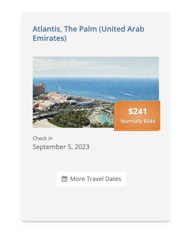 We do work with many major OTAs to find the best prices, so let's go ahead and select a different property to see how things work on other platforms. For our second property, we picked the famous Atlantis on The Palm in Dubai – one of the most luxurious hotels in the city and home to the world’s biggest water park.