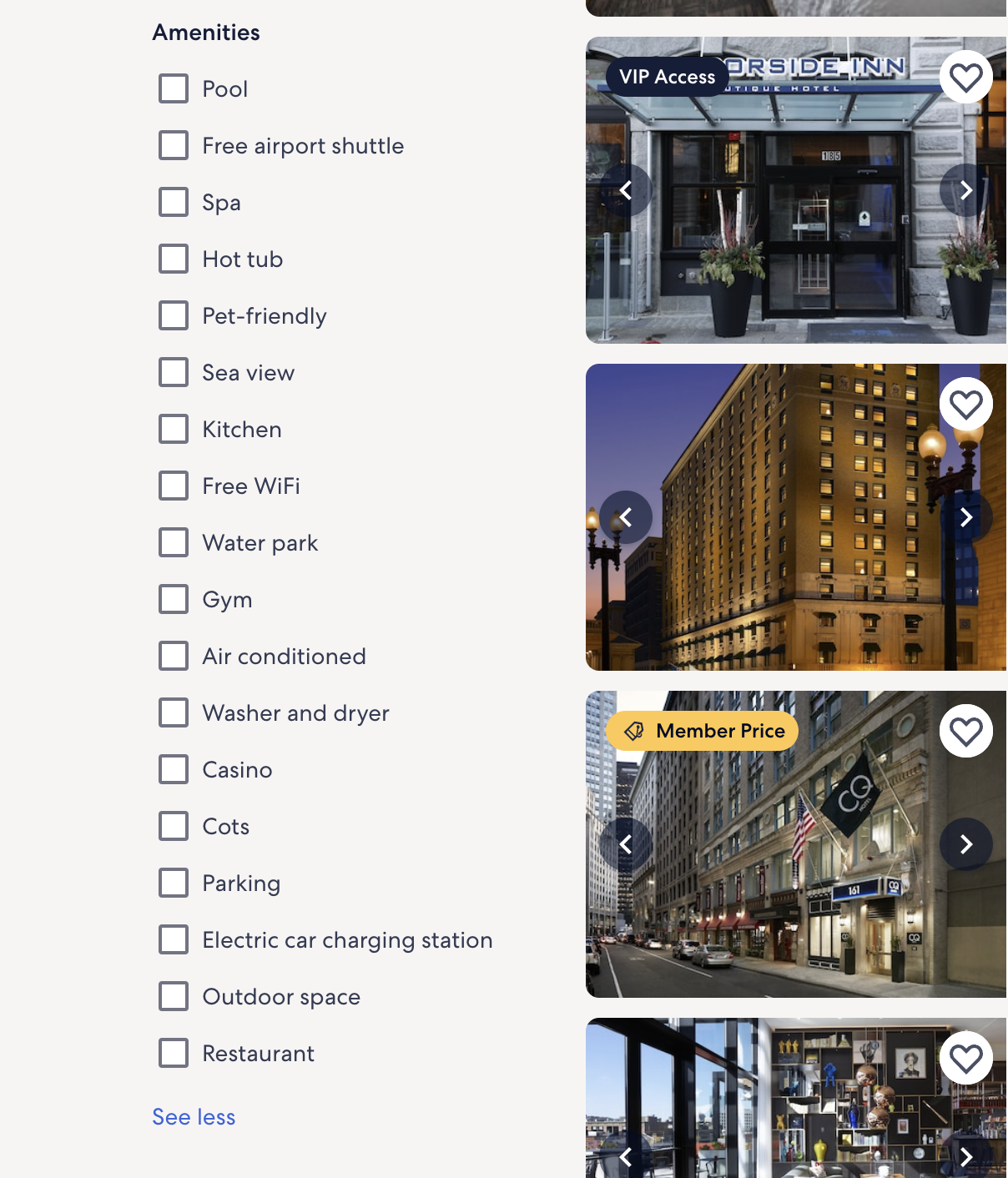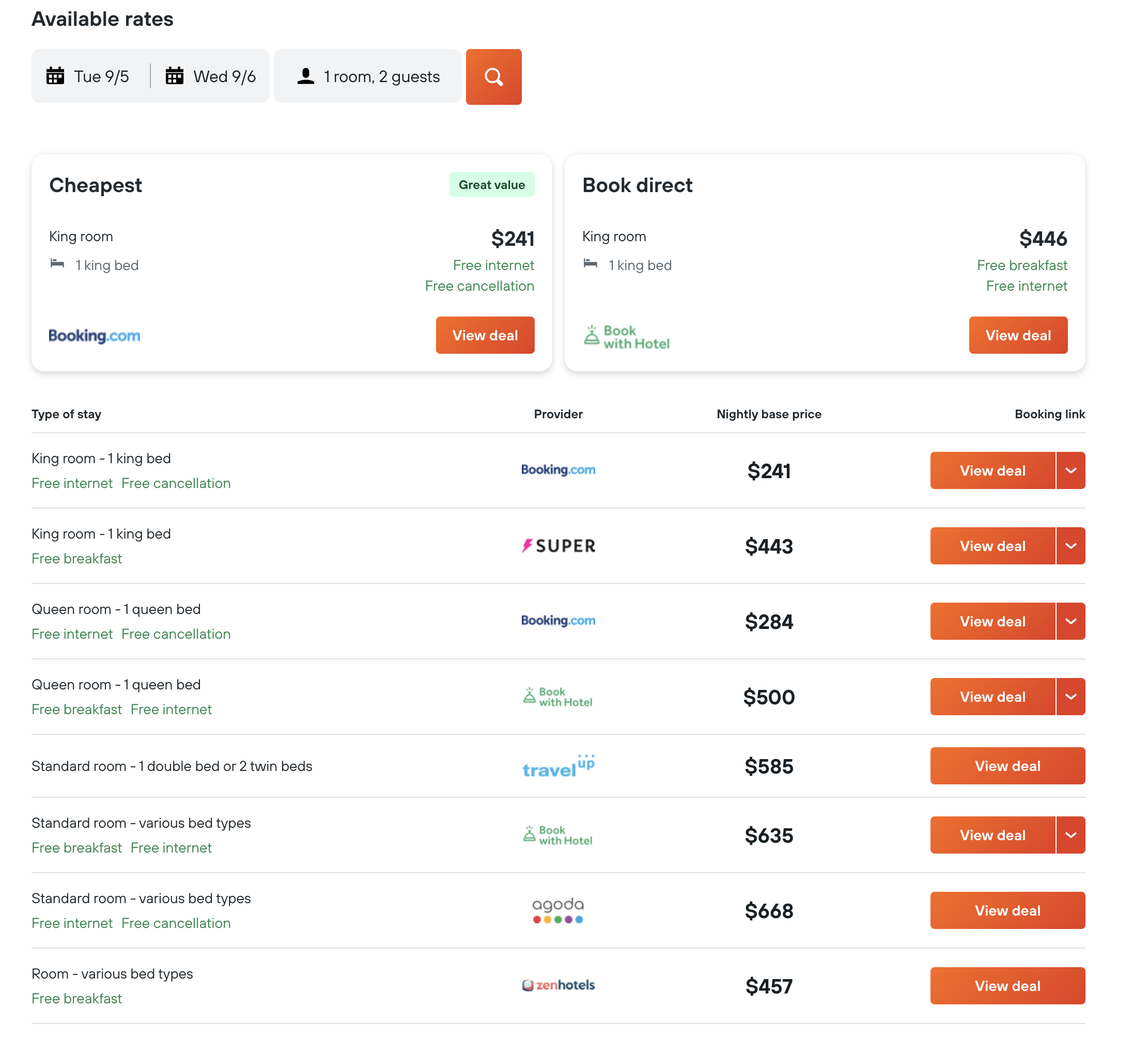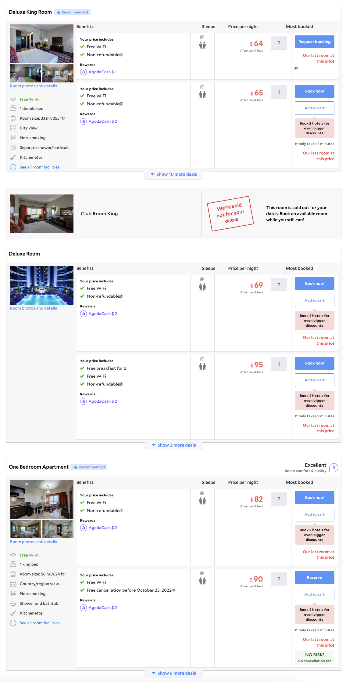 - If you see it, always click the ‘show more deals’ at the bottom of each room type to see how much extra it costs to add things like breakfast and free cancelation.