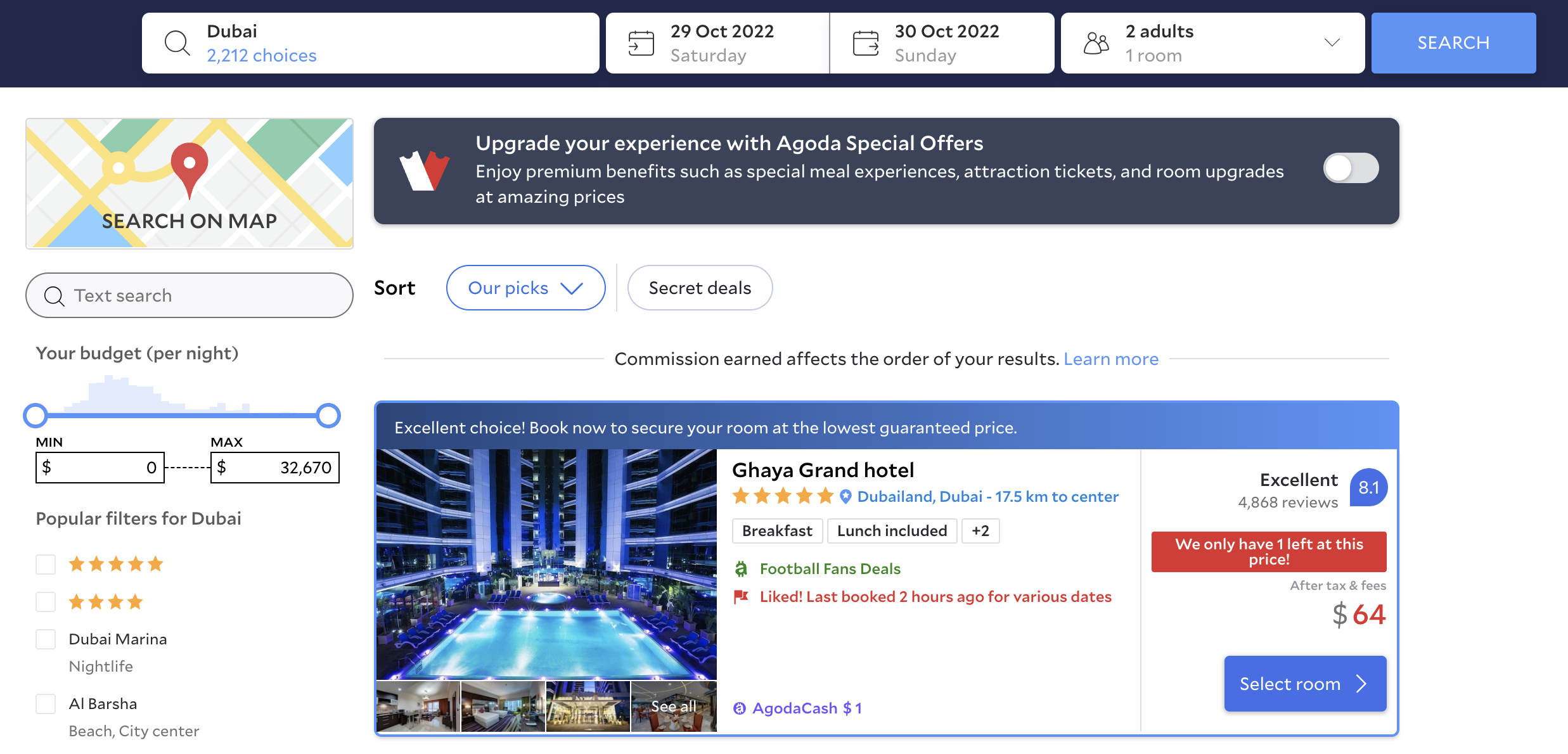 This brings up our chosen hotel at the top of the results, but also allows us to see some other hotels and their pricing for the same night. It’s come up a little more expensive than we expected, probably because Agoda builds in all our taxes and fees, but is still an excellent bargain for a five-star hotel in Dubai.