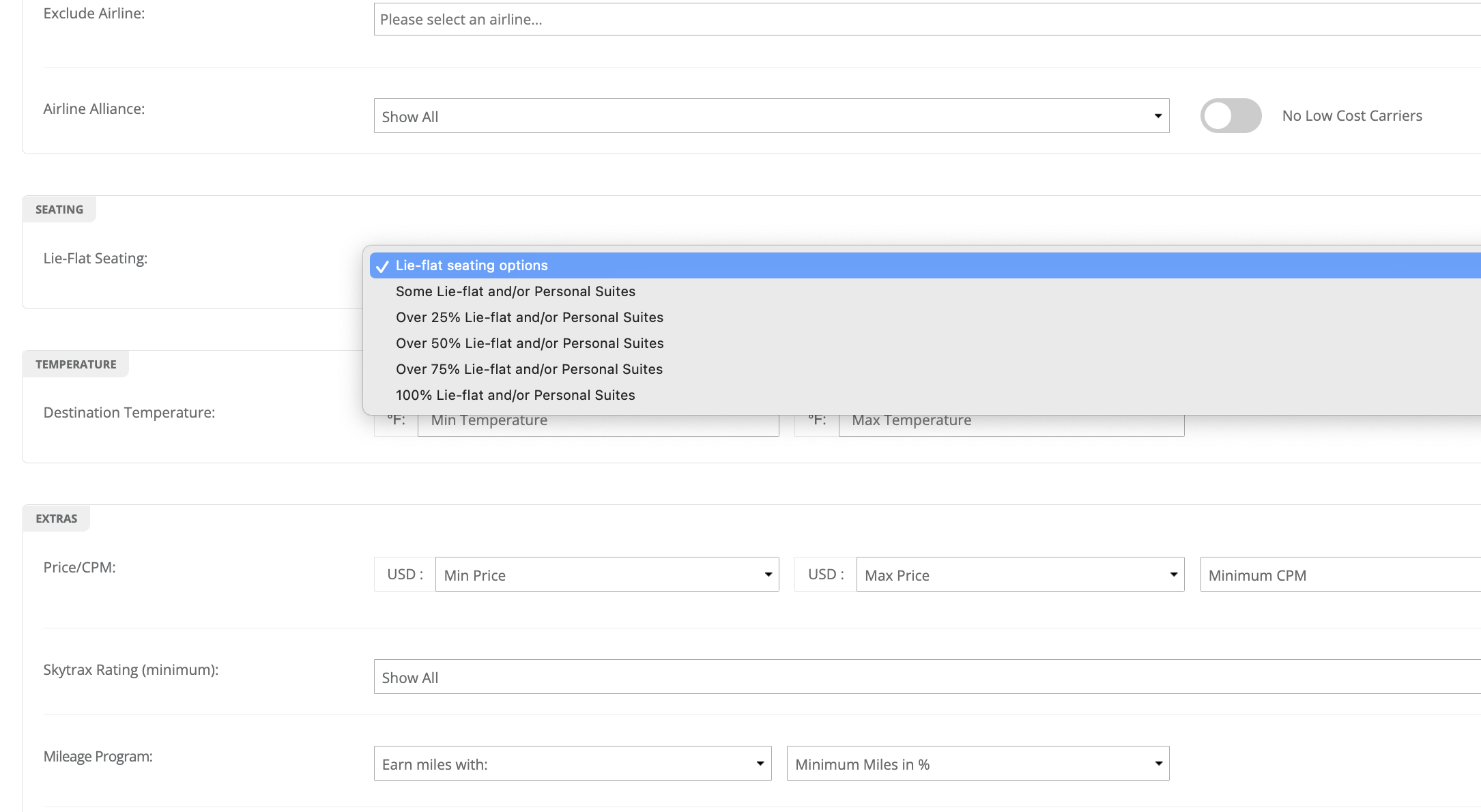 - Consider lowering the lie flat percentage: Choosing 100% lie flat will only show you flights from your origin point that pick up on a lie flat equipped aircraft and have all lie flat seats for the entirety of the route. Changing this to 75% or 50% will also show you connecting flights that maybe have smaller aircraft for part of the route, but could save you thousands of dollars on the trip.