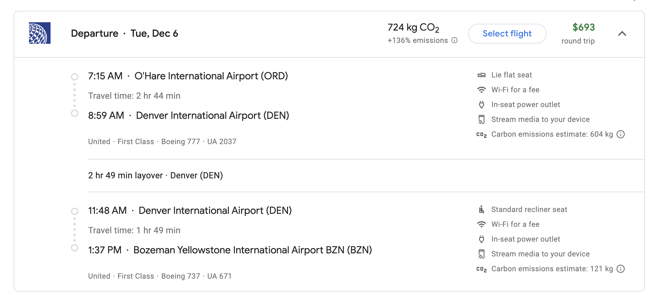 From here, we can see the trip is partly on a widebody, from O’Hare to Denver, with flat seats. However, the final one hour and 40-minutes is on United’s 737 with recliner seating. It’s not a bad deal, but could we do better?