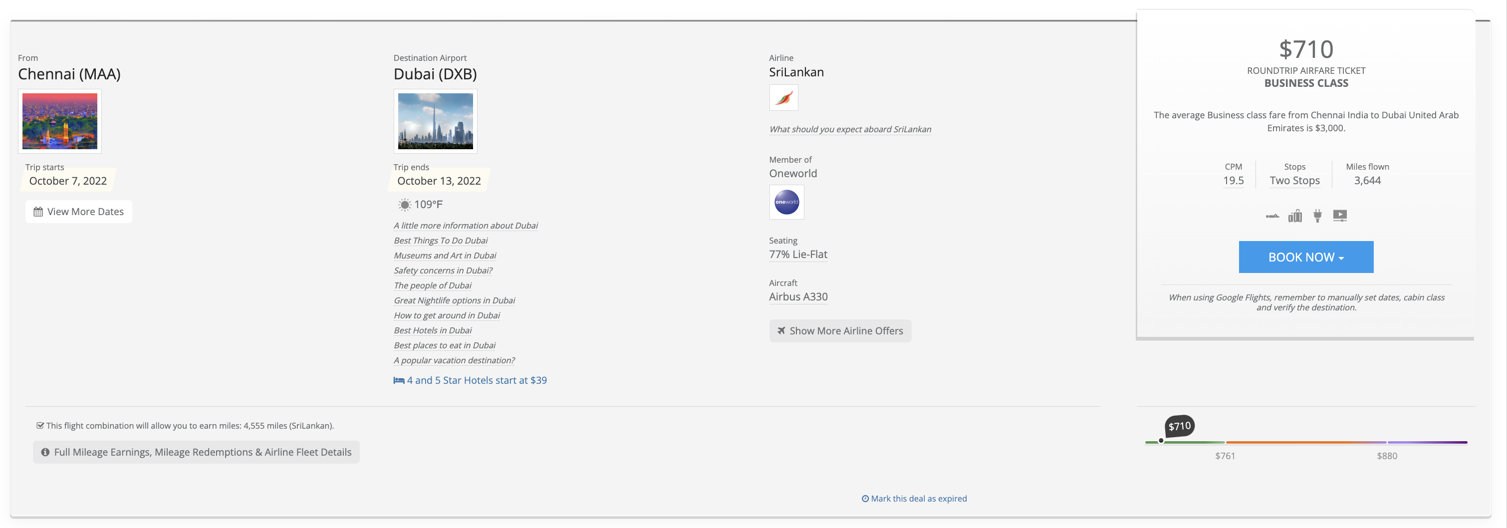 Now we can see some cracking international deals – Chennai to Dubai for $710 in fully flat business class for 77% of the trip. That’s $19.50 per mile – a much better value deal than our domestic US flight. Can we go any lower?