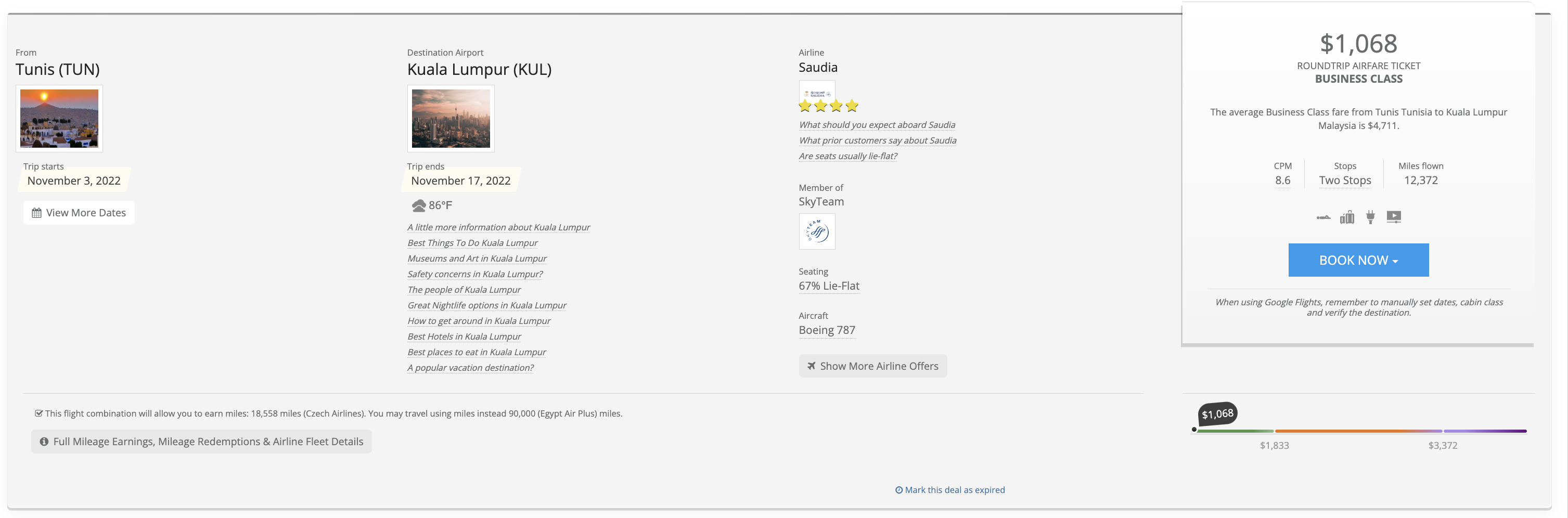 Setting CPM to $10 or less, there are still deals to be had. Top of the crop here is a flight in November from Tunis to Kuala Lumpur for just over $1,000. This is a CPM of $8.60 and a significant saving for a flight that is usually priced at some $4,700.