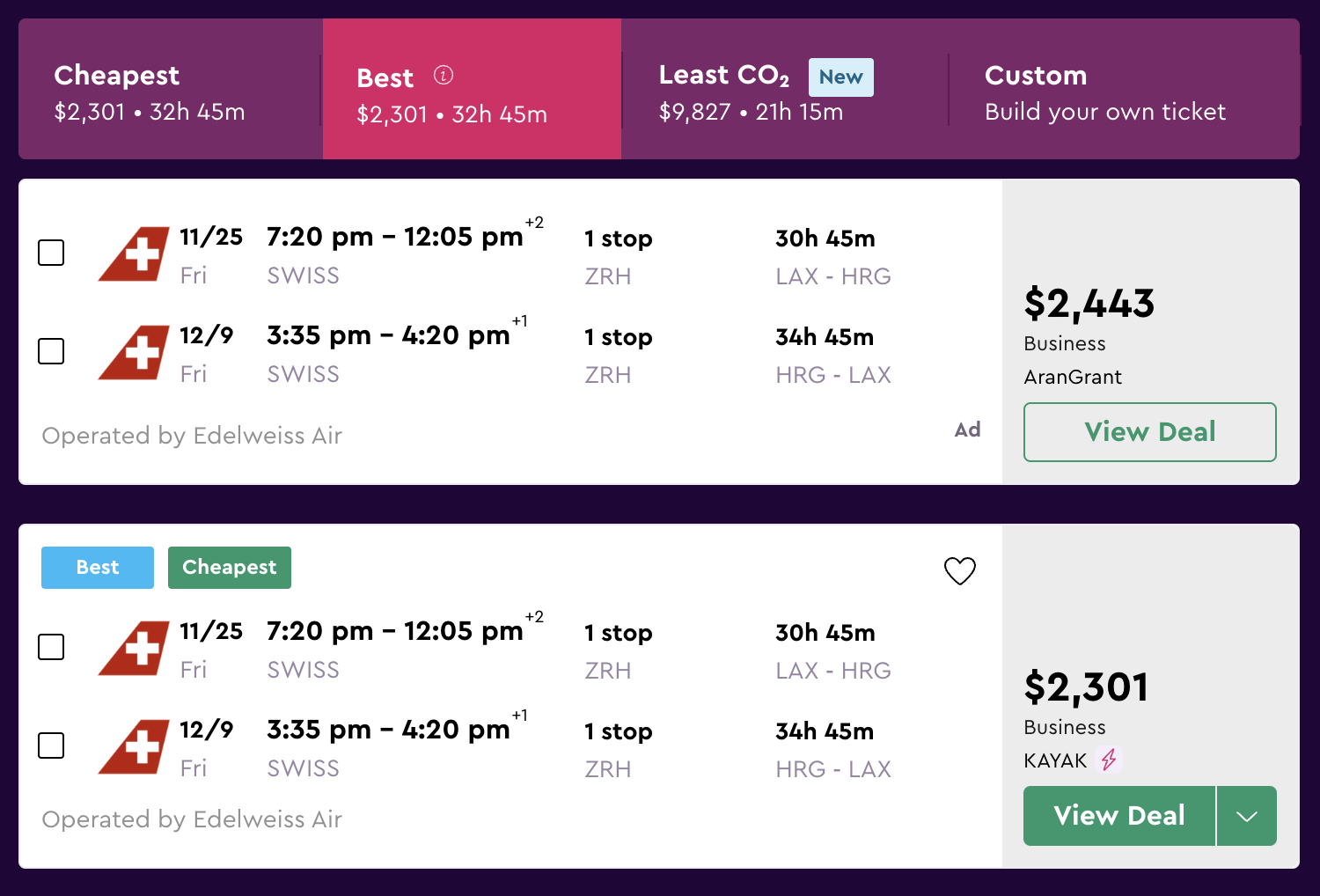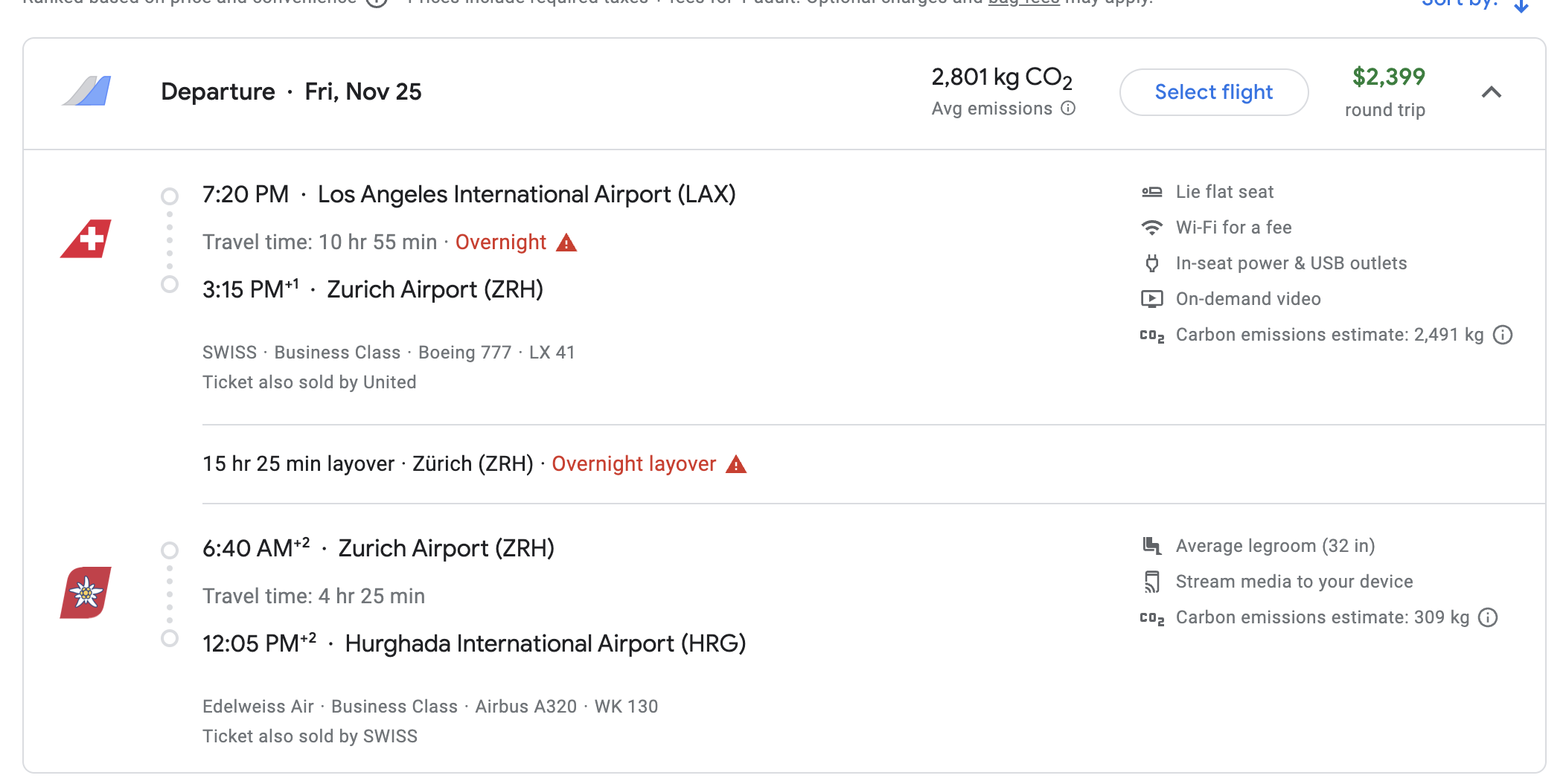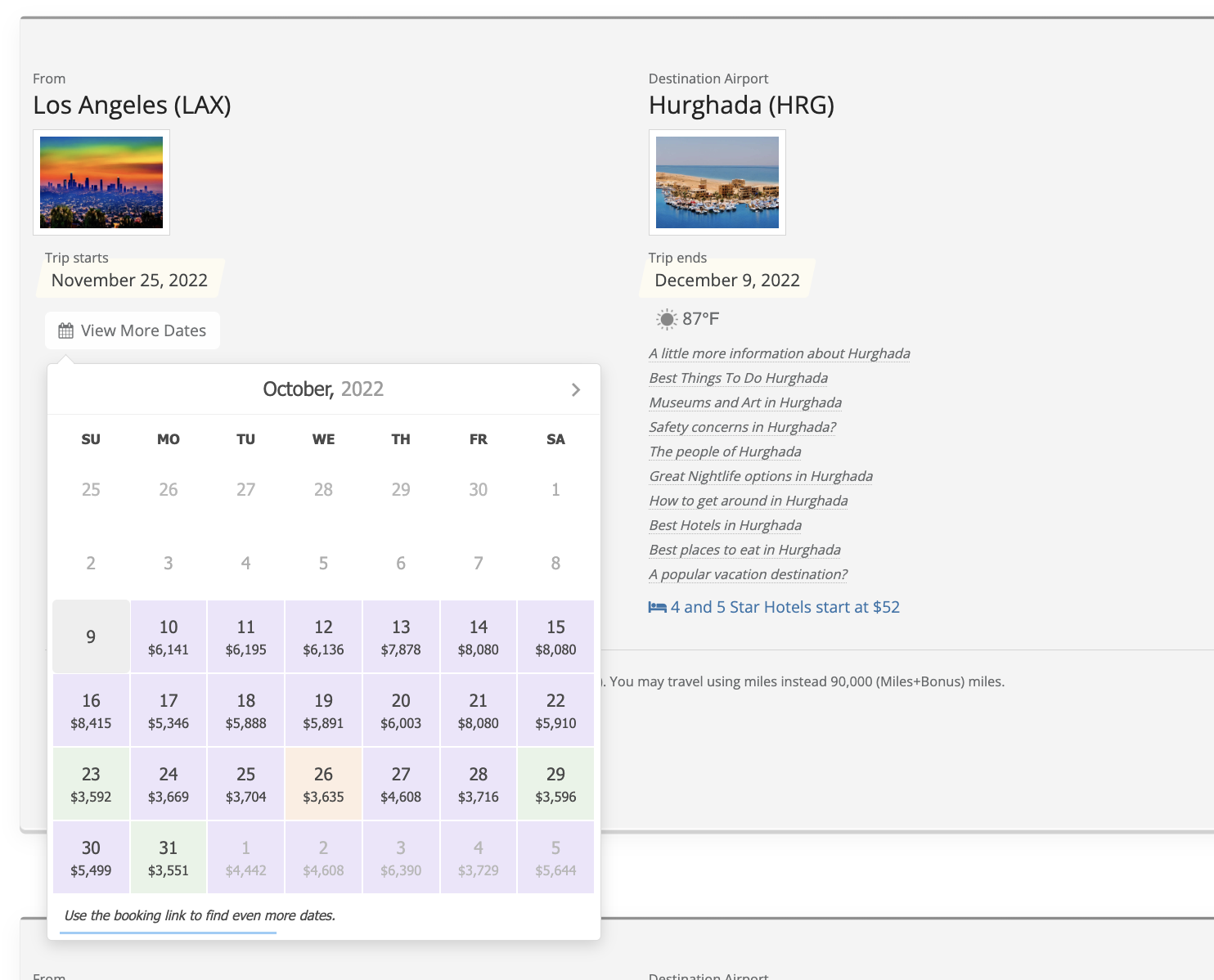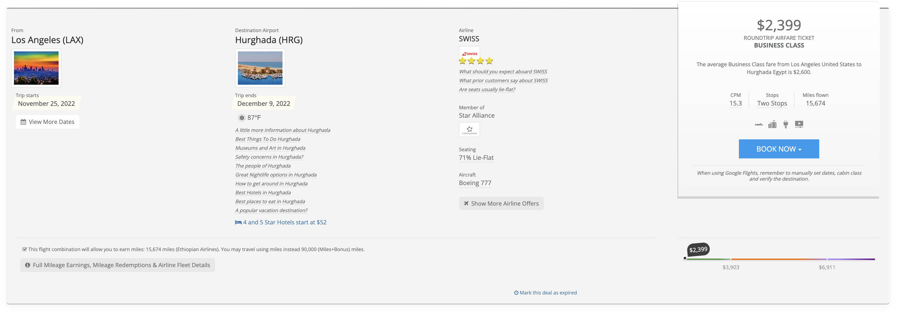 Searching with our low CPM results displayed first, the top airfare at the time of searching is LAX to Hurghada in late November for under $2,400. It’s 71% lie flat seating on the SWISS Boeing 777, with a CPM of $15.30. Not bad!