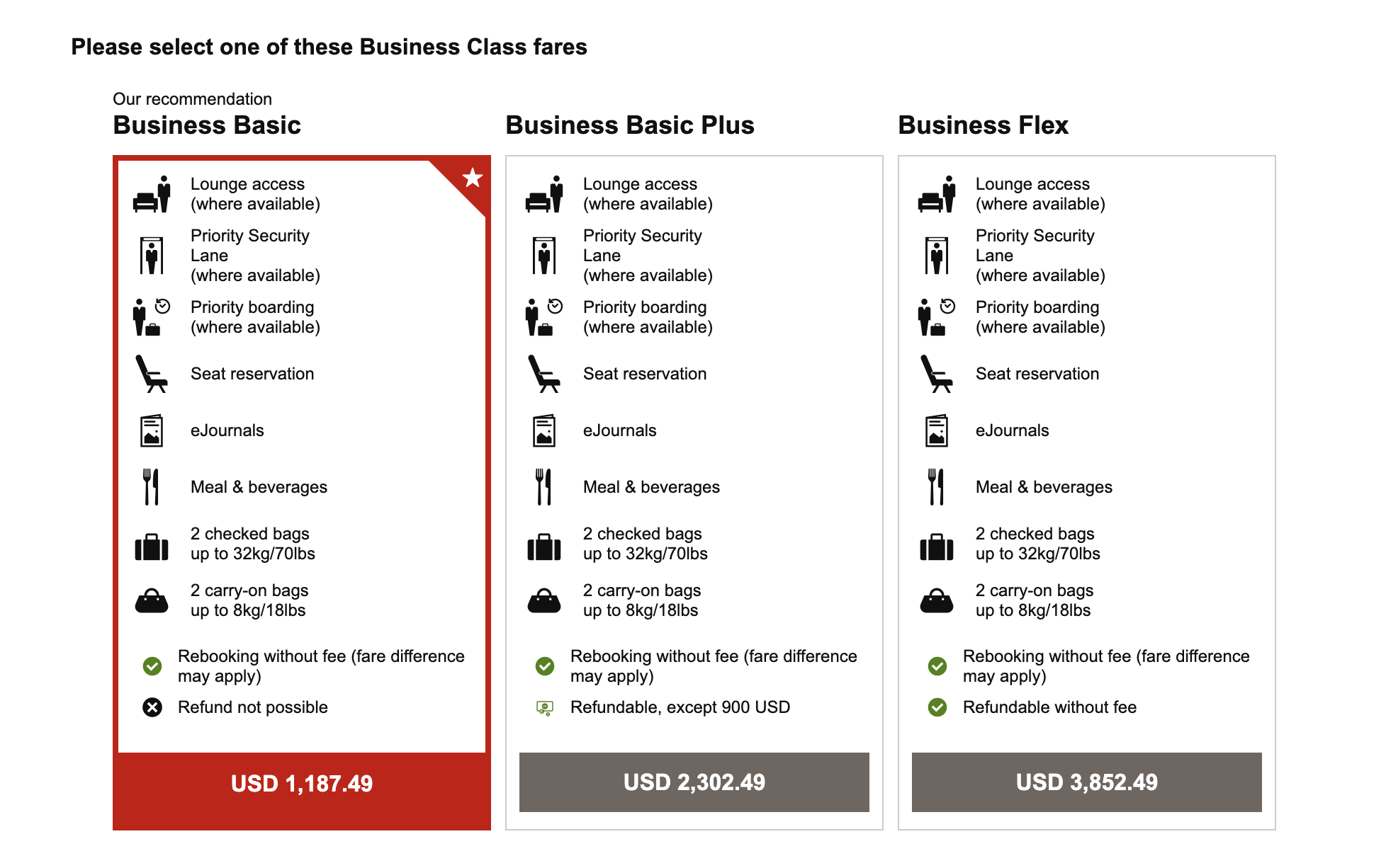 The booking engine at SWISS required the input of all our choices again. From there, we honestly found it very difficult to track down our offer price again. We could see some good offers on the outbound, but even on ‘business basic’ we couldn’t get the price as low as it was appearing on the other search engines.